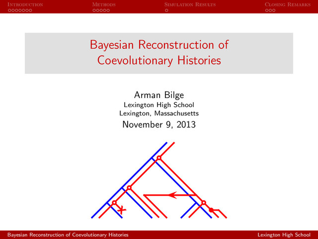& Offner, S. (2008). The American Biology Teacher, 70(4), 222–229. Bayes, T. & Price, R. (1763). Phil. Trans. 53, 370–418. Charleston, M. A. (2009). A new likelihood method for cophylogenetic analysis. Drummond, A. J., et al. (2012). Mol. Biol. Evol. 29(8), 1969–1973. Faria, N. R., et al. (2013). Phil. Trans. R. Soc. B, 368(1614). Felsenstein, J. (1981). J. Mol. Evol. 17(6), 368–376. Felsenstein, J. (2004). Inferring phylogenies. Sunderland, MA: Sinauer. Hafner, M. S. & Nadler, S. A. (1988). Nature, 332(6161), 258–259. Huelsenbeck, J. P., Rannala, B., & Larget, B. (2000). Evolution, 54(2), 352–364. Kingman, J. F. C. (1982). Stochastic Processes and their Applications, 13(3), 235–248. Segraves, K. A. (2010). Evo. Edu. Outreach, 3(1), 62–70. Sj¨ ostrand, J., et al. (In prep.). A Bayesian method for analyzing lateral gene transfer. Bayesian Reconstruction of Coevolutionary Histories Lexington High School