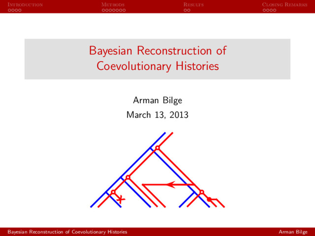Jessica Wu, Rachel Sealfon, and Prof. Mukul Bansal Andrew Brownjohn, Jon Sanders, Prof. Ran Libeskind-Hadas, Hayden Metsky, and Prof. Manolis Kellis, for helpful discussions Dr. Susan Offner, for inspiring me Bayesian Reconstruction of Coevolutionary Histories Arman Bilge