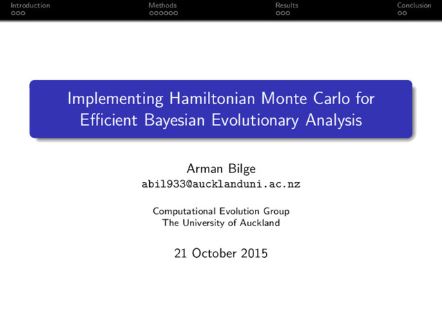 MCMC On average, HMC was 5x more efficient than MCMC Open source implementation at http://github.com/armanbilge/B3/tree/hamilton Future Work Inferring parameters for other evolutionary models Moving between tree topologies Automatic tuning of HMC for optimal performance Implementing and testing more sophisticated flavors of HMC