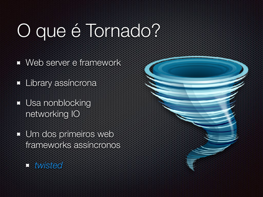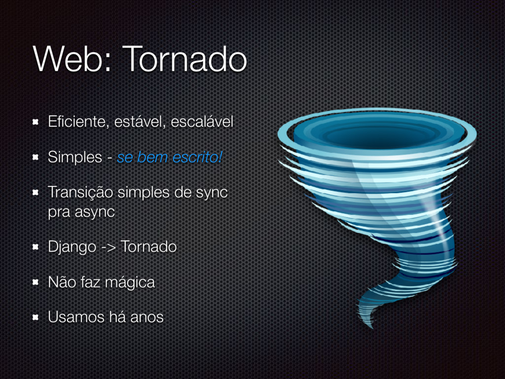 Como usar Tornado para escrever apps mais eficientes, desenvolvidos tão rapidamente quanto apps síncronos, ilustrado com case de API de pagamentos de uma grande enterprise.