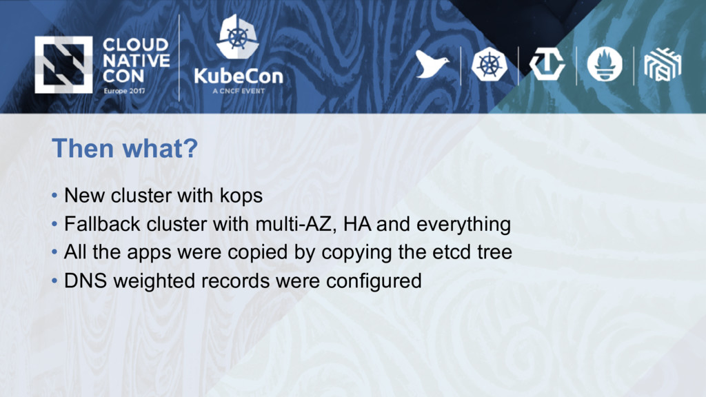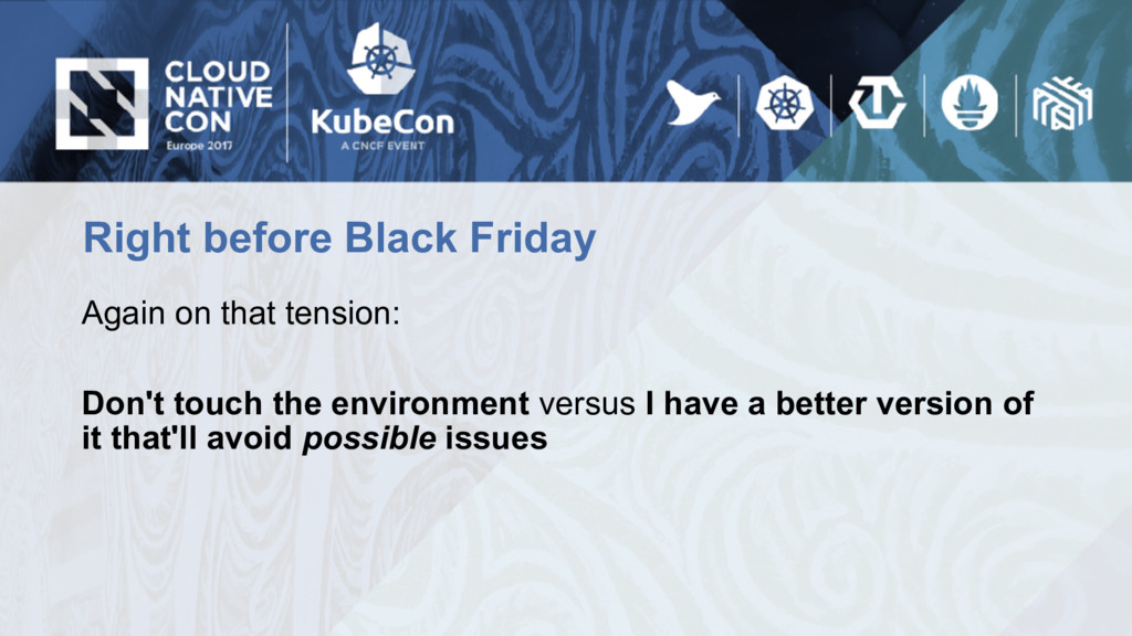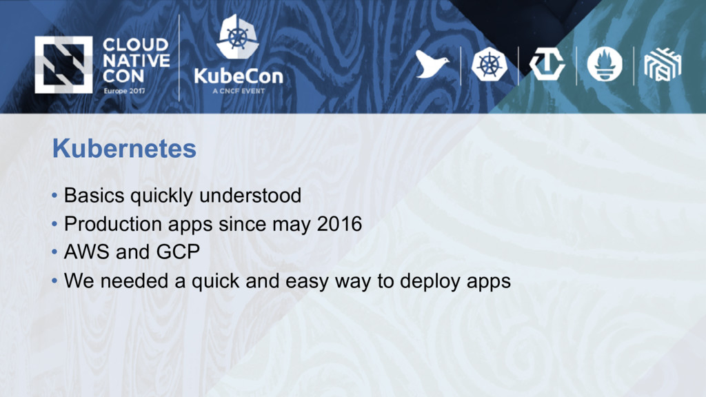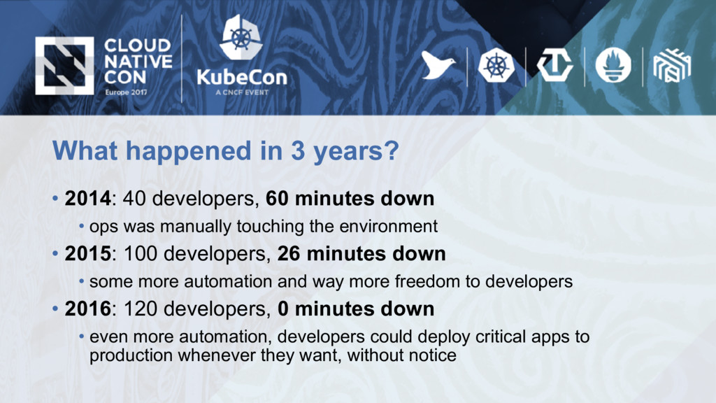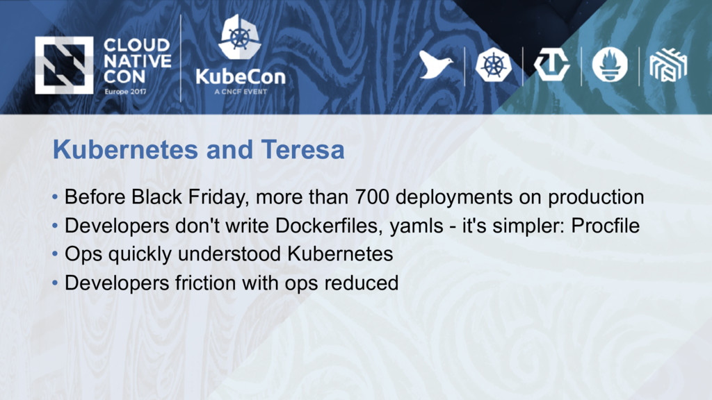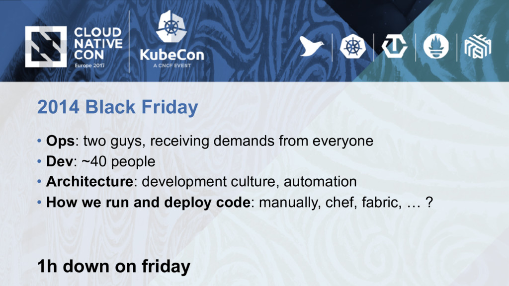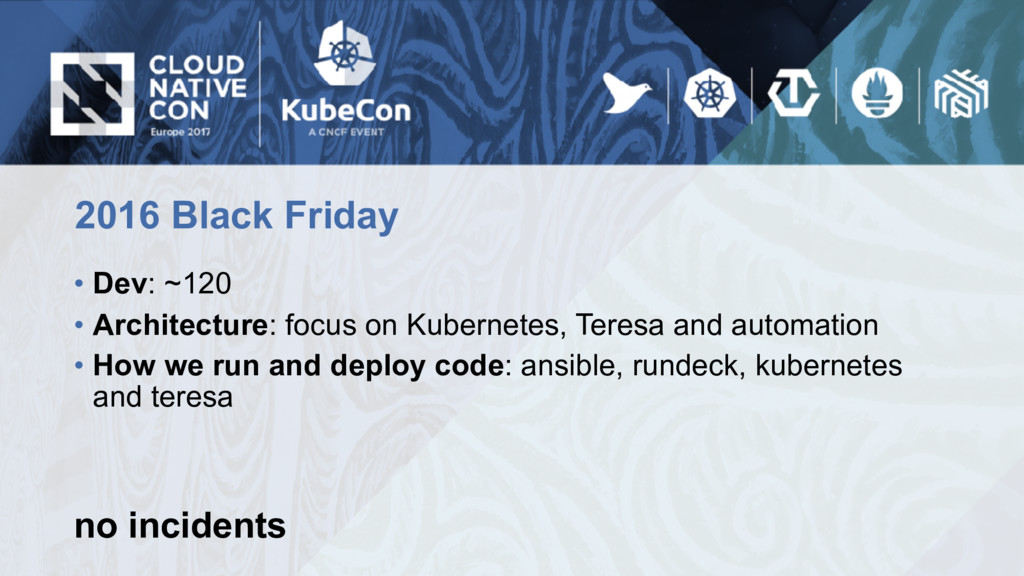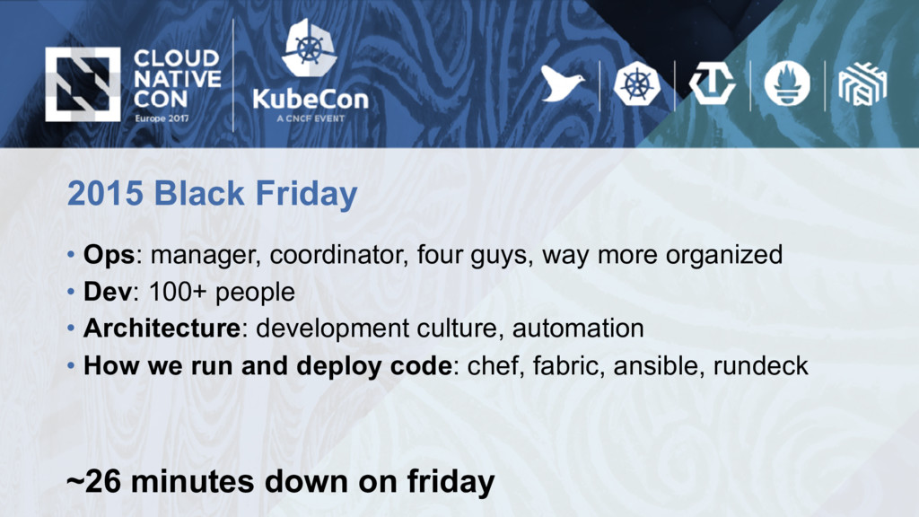 How we deploy the apps, and ended up writing an open source deployment tool; how we scale our clusters; contingency plans; cultural impact on application development; ultimately how kubernetes helped us going through a black friday smoothly.