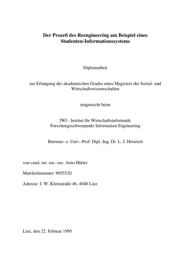 neuen Konzepten“, in: Mertens, Hasenkamp: „Wirtschaftsinformatik 2/92“, Vieweg & Sohn Ver- lagsgesellschaft, Braunschweig/Wiesbaden 1992, S. 125-126 Frazer, A.: „Reverse-Engineering - hype, hope or here“, in: Hall, P.: „Software Reuse and Reverse-Engineering in Practice“, Chapman & Hall, London 1992 Heinrich, Lehner, Roithmayr: „Informations- und Kommunikationstechnik“, 3. Auflage, R. Oldenbourg Verlag, München/Wien 1993 Heinrich, Roithmayr: „Wirtschaftsinformatik-Lexikon“, 4. Auflage, R. Oldenbourg Verlag, München/Wien 1992 Kaufmann, A.: „Software-Reengineering: Analyse, Restrukturierung und Re- verse-Engineering von Anwendungssystemen“, R. Oldenbourg Verlag, Mün- chen/Wien 1994 Krallmann, Wöhrle: „Marktübersicht CARE-Tools“, in: Mertens, Hasenkamp: „Wirtschaftsinformatik 2/92“, Vieweg & Sohn Verlagsgesellschaft, Braun- schweig/Wiesbaden 1992, S. 181-189 Pomberger, Blaschek: „Software Engineering“, Carl Hanser Verlag, Mün- chen/Wien 1993 Reindl, M.: „Re-Engineering des Datenmodells“, in: Schmitz, Szyperski, Mer- tens: „Wirtschaftsinformatik 4/91“, Vieweg & Sohn Verlagsgesellschaft, Braunschweig/Wiesbaden 1991, S. 281-289 Richter, L.: „Wiederbenutzbarkeit und Restrukturierung oder Reuse, Reengineering und Reverse-Engineering“, in: Mertens, Hasenkamp: „Wirt- schaftsinformatik 2/92“, Vieweg & Sohn Verlagsgesellschaft, Braun- schweig/Wiesbaden 1992, S. 127-136 Thurner, R.: „ReEngineering und Innovation in der Anwendungsentwicklung“, in: Kurbel, K.: „Wirtschaftsinformatik ‘93“, Physica Verlag, Heidelberg 1993, S. 39-52