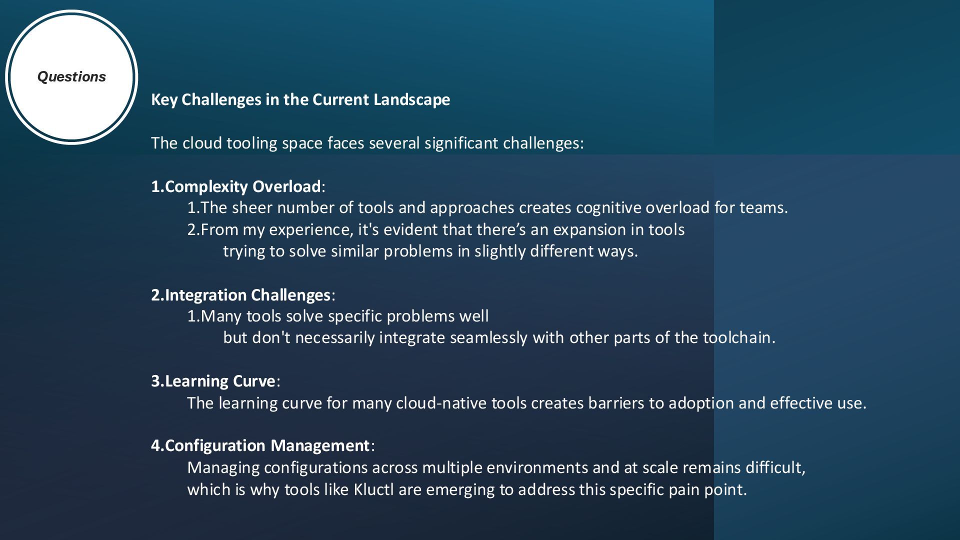 space faces several significant challenges: 1.Complexity Overload: 1.The sheer number of tools and approaches creates cognitive overload for teams. 2.From my experience, it's evident that there’s an expansion in tools trying to solve similar problems in slightly different ways. 2.Integration Challenges: 1.Many tools solve specific problems well but don't necessarily integrate seamlessly with other parts of the toolchain. 3.Learning Curve: The learning curve for many cloud-native tools creates barriers to adoption and effective use. 4.Configuration Management: Managing configurations across multiple environments and at scale remains difficult, which is why tools like Kluctl are emerging to address this specific pain point.