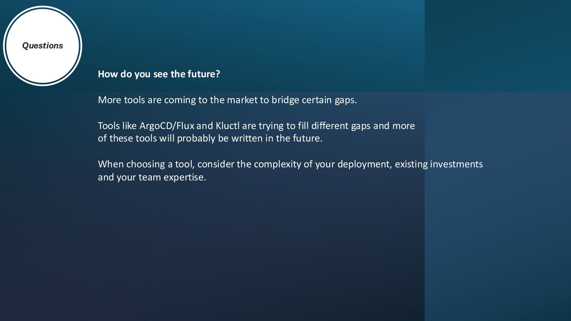 coming to the market to bridge certain gaps. Tools like ArgoCD/Flux and Kluctl are trying to fill different gaps and more of these tools will probably be written in the future. When choosing a tool, consider the complexity of your deployment, existing investments and your team expertise.