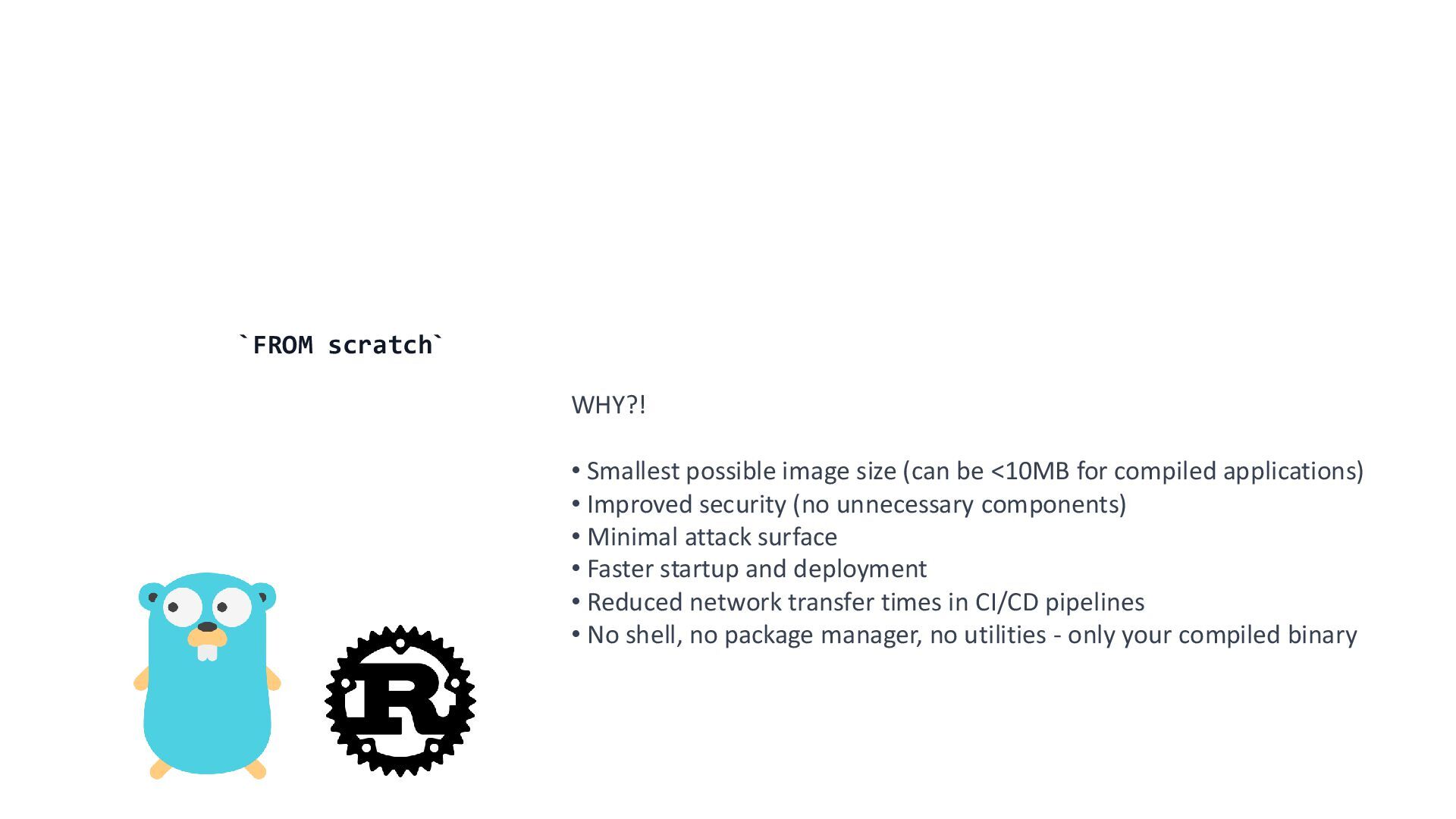 <10MB for compiled applications) • Improved security (no unnecessary components) • Minimal attack surface • Faster startup and deployment • Reduced network transfer times in CI/CD pipelines • No shell, no package manager, no utilities - only your compiled binary