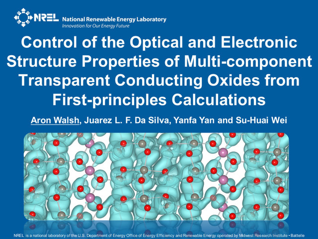 Transparent Conducting Oxides from First-principles Calculations NREL is a national laboratory of the U.S. Department of Energy Office of Energy Efficiency and Renewable Energy operated by Midwest Research Institute • Battelle Aron Walsh, Juarez L. F. Da Silva, Yanfa Yan and Su-Huai Wei