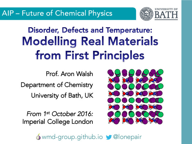the past decade. Its predictive power is increasing, which can be exploited for pushing the boundaries of chemical physics. Group Members: PV – Lucy, Federico, Suzy, Keith, Youngkwang, Dan, Jarvist; MOFs – Jess, Katrine; Metastability – Jonathan, Lora, Ruoxi Collaborators: Mark van Schilfgaarde (KCL); Saiful Islam (Bath); Piers Barnes and Brian O’Regan (ICL); Alexey Sokol and David Scanlon (UCL); Atsushi Togo (Kyoto) Slides: https://speakerdeck.com/aronwalsh