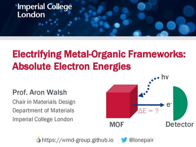but challenging for theory and experiment 2. Electroactive MOF knowledge is increasing towards rational control of functionality Collaborators: Keith Butler (Bath); Chris Hendon (MIT); Yu Kumagai & Fumiyasu Oba (Tokyo Tech); Su-Huai Wei (Beijing CSRC); Alexey Sokol & John Buckeridge (UCL); Jorge Gascon (Delft) Funders: JSPS; ERC; EPSRC; Royal Society Slides: https://speakerdeck.com/aronwalsh