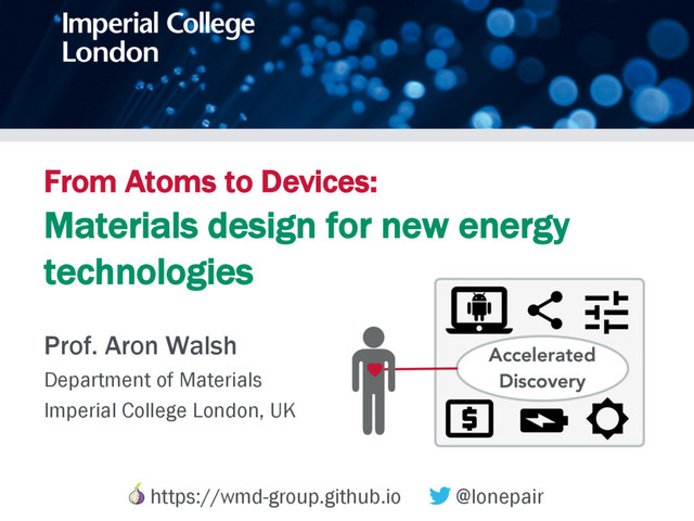 earth-abundant alternatives. Given the vast quantity of potential materials, even predictions with experimental validation1. The rapid increase in computer processing power and the availability of ality. From a pool of 400 unknown compositions, 15 new compounds have structures and properties. Structural prediction Property simulation Targeted synthesis Chemical input Figure 1 | A modular materials design procedure, where an initial selection of chemical elements is subject to a series of optimization and screening steps. Each step may involve prediction of the crystal structure, assessment of the chemical stability or properties of the candidate materials, before being followed by experimental synthesis and characterization. A material may be targeted based on any combination of properties, for example a large Seebeck coefficient and low lattice thermal conductivity for application to heat-to-electricity conversion in a thermoelectric device. A. Walsh, Nature Chemistry 7, 274 (2015) Slides: https://speakerdeck.com/aronwalsh