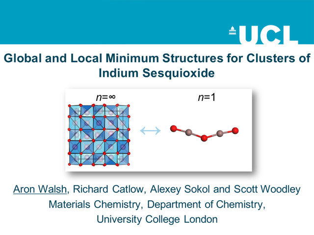 describes bulk and cluster properties. • n < 4 clusters have distinct symmetric global minima. • n > 4 clusters tend towards bulk-like, low symmetry particles. • Open framework clusters have high energetic cost. • HOMO and LUMO character is consistent with bulk. Future work: • Extend to higher n. • Explore excited state properties. Acknowledgements: Materials Chemistry Consortium (Access to Hector); EU FP7 (Marie Curie Fellowship).