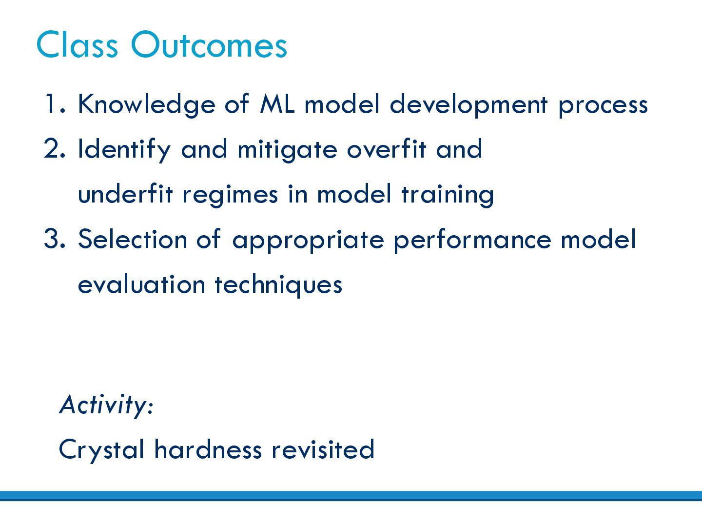 Identify and mitigate overfit and underfit regimes in model training 3. Selection of appropriate performance model evaluation techniques Activity: Crystal hardness revisited