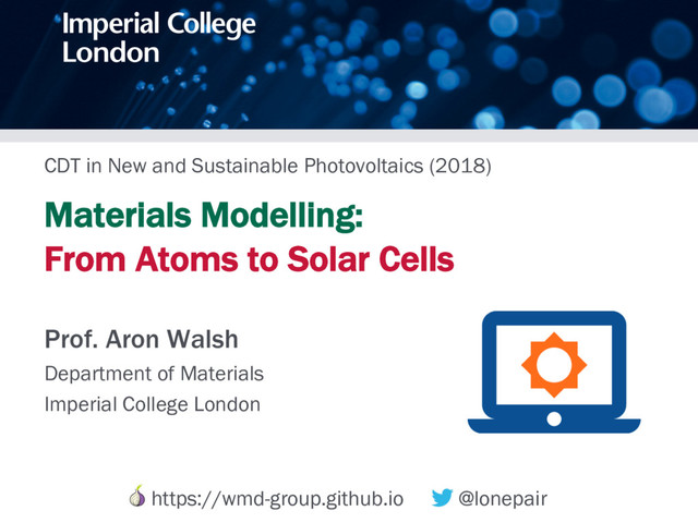 time scales • First-principles techniques can accurately predict structure and properties • Materials data and reproducibility is becoming increasingly important Slides: https://speakerdeck.com/aronwalsh news & views e spoiled for urally occurring iodic table give y compounds ry compounds ompounds, each element inations exceed nent system. the number of ALS uest for new functionality tanding of the chemical bond, advances in synthetic chemistry, and large-scale computation, ow become a reality. From a pool of 400 unknown compositions, 15 new compounds have pt the expected structures and properties. Structural prediction Property simulation Targeted synthesis Chemical input Figure 1 | A modular materials design procedure, where an initial selection of chemical elements is subject to a series of optimization and screening steps. Each step may involve prediction of the crystal Future: