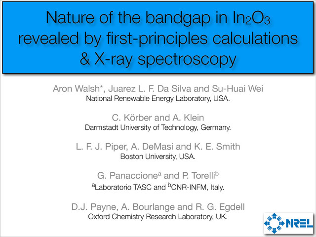 & X-ray spectroscopy Aron Walsh*, Juarez L. F. Da Silva and Su-Huai Wei National Renewable Energy Laboratory, USA. C. Körber and A. Klein Darmstadt University of Technology, Germany. L. F. J. Piper, A. DeMasi and K. E. Smith Boston University, USA. G. Panaccionea and P. Torellib aLaboratorio TASC and bCNR-INFM, Italy. D.J. Payne, A. Bourlange and R. G. Egdell Oxford Chemistry Research Laboratory, UK.
