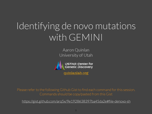 start end ref alt filter qual gene impact variant_id family_id family_members family_genotypes samples family_count chr2 96525735 96525736 T C None 1929.31 ANKRD36C non_syn_coding 2537 family1 1805,1847,4805 T/T,T/T,T/C 4805 1 chr2 96525749 96525750 T A None 1513.36 ANKRD36C non_syn_coding 2538 family1 1805,1847,4805 T/T,T/T,T/A 4805 1 chr2 96525754 96525755 A T None 1699.28 ANKRD36C non_syn_coding 2539 family1 1805,1847,4805 A/A,A/A,A/T 4805 1 chr15 41229630 41229631 T G None 2116.49 DLL4 non_syn_coding 7892 family1 1805,1847,4805 T/T,T/T,T/G 4805 1 chr17 55183812 55183813 A G None 2155.84 AKAP1 non_syn_coding 13311 family1 1805,1847,4805 A/A,A/A,A/G 4805 1 chr22 43027436 43027437 C T None 1320.03 CYB5R3 non_syn_coding 16718 family1 1805,1847,4805 C/C,C/C,C/T 4805 1 Phenotype: blue skin disease $ gemini de_novo \ -‐-‐columns "chrom, start, end, ref, alt, \ filter, qual, gene, impact" \ -‐d 15 \ -‐-‐filter "filter is NULL \ and is_coding = 1 and impact_severity != ‘LOW’ \ and (aaf_1kg_eur <= 0.005 or aaf_1kg_eur is NULL) \ and (aaf_esp_ea <= 0.005 or aaf_esp_ea is NULL)" \ trio.trim.vep.denovo.db Which gene can we rule out at a glance? 30