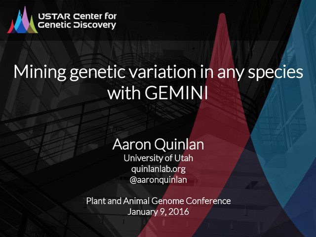 variation from WES and WGS studies. • Integrates variants, genotypes, phenotypes and annotations into a simple database. • Current focus: • Improving scalability for WGS • Support for any (diploid) species • Expected release: April 2016 github.com/arq5x/gemini gemini.rtfd.org