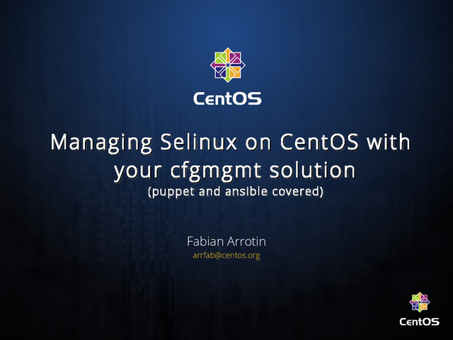 : • By default puppet will try to use the correct context • Doesn't add it to defaults ! (so “semanage fcontext”) • You can ignore that (to avoid matchpathcon): selinux_ignore_defaults => on, file {'/var/www/html/vhost1/cgibin/blabla.pl': source => 'puppet:///modules/bla/blabla.pl', mode => '0755', owner => apache, group => apache, seltype => "httpd_user_script_exec_t", }