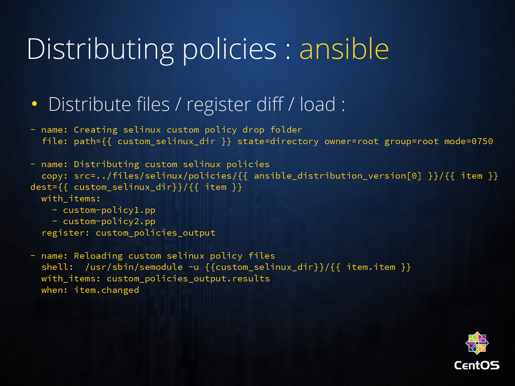store your .pp files • Not under /etc/selinux/targeted (deleted/dynamic !) • Distribute your policies • ! with latest selinux-policy-targeted ! • Load them, enjoy