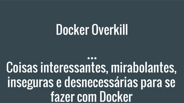 Nessa palestra vou explorar algumas coisas não convencionais que aprendi ao longo do tempo em que usei Docker. Darei exemplos de como isso pode ser divertido, desastroso, inseguro, e claro, como pode ser útil.