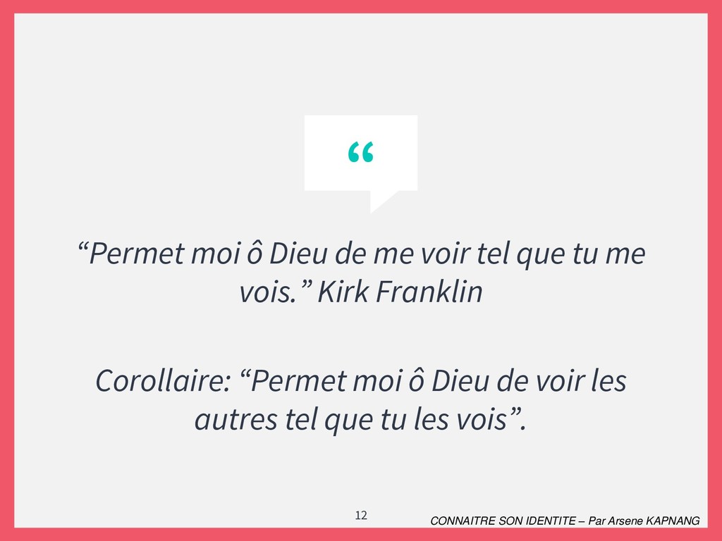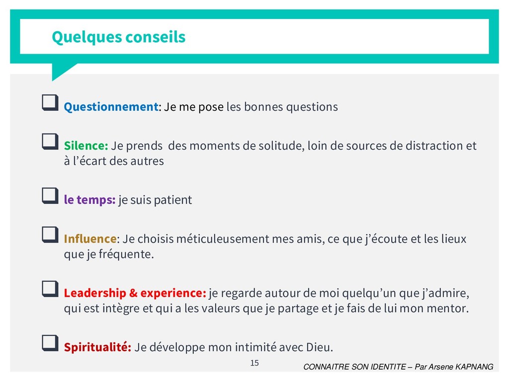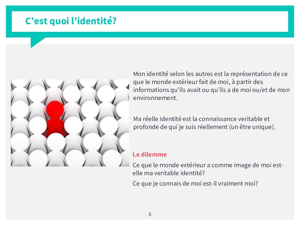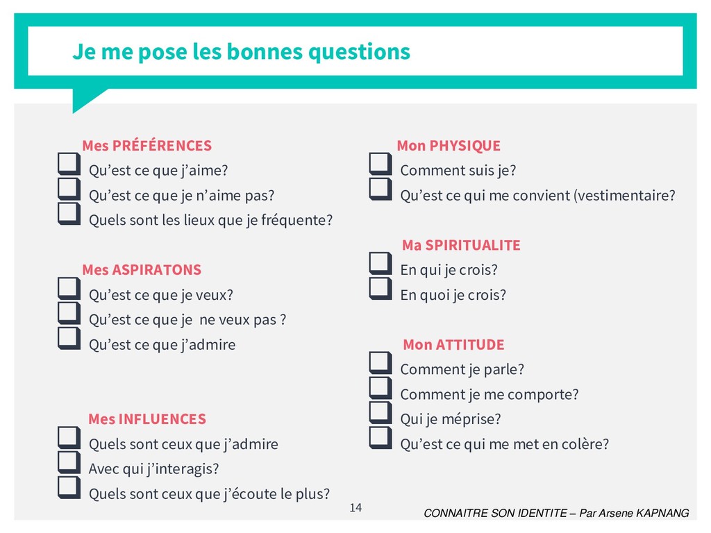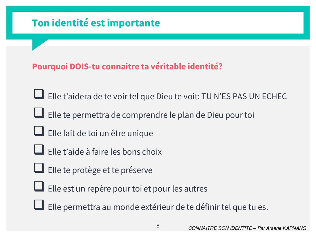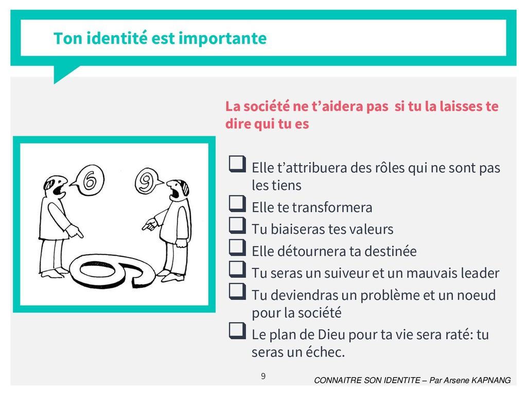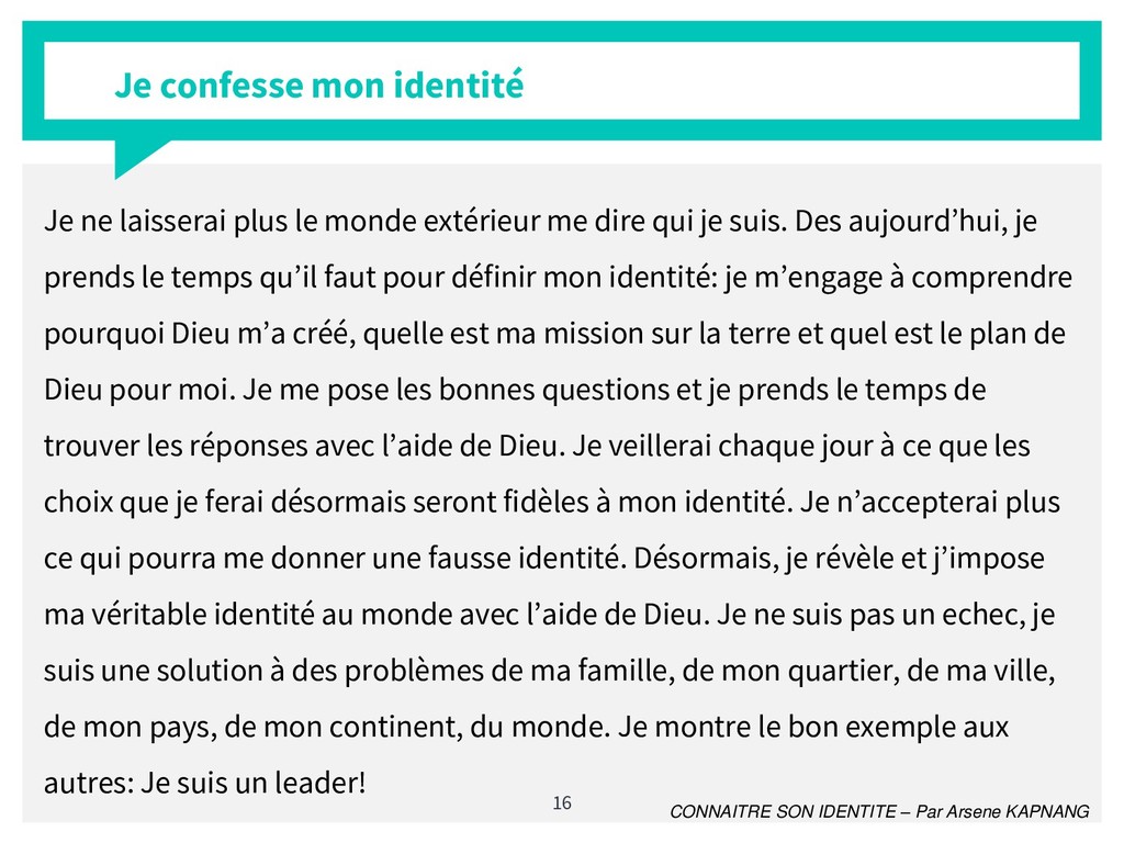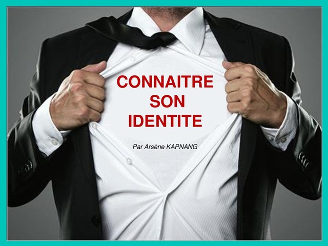Il est difficile de nos jours de véritablement dire qui l'on est. le formalisme de la société a tendance à nous transformer et nous attribuer des rôles qui ne sont pas les nôtres. La connaissance de sa véritable identité dans un tel contexte est plus que crucial. En de mots simples et avec un style pédagogique accessible et méthodologique, j'ai apporté ma contribution à ce vaste thème.