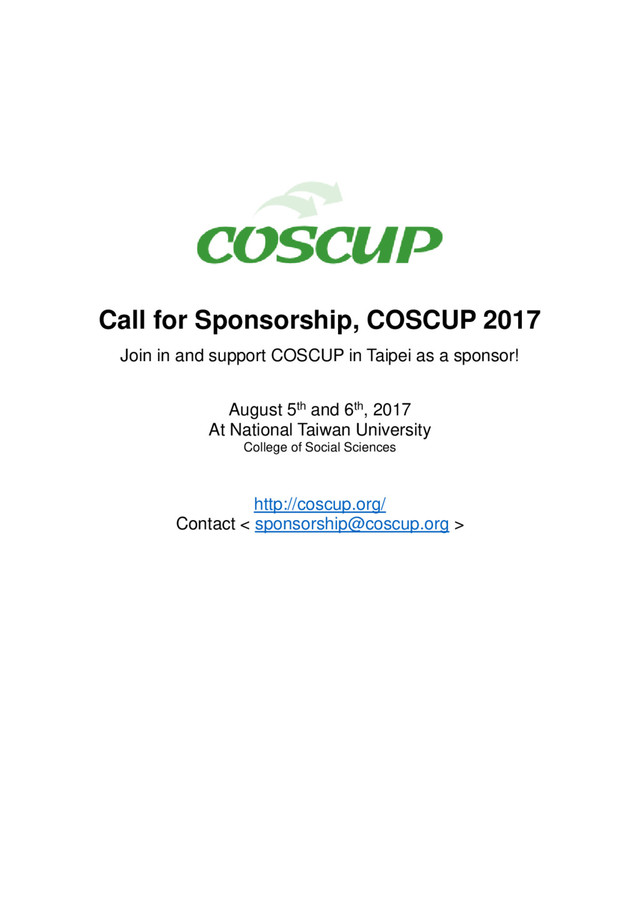 ─ Brand logo and links on the web pages of the COSCUP website. ─ Introduction of company in Chinese (200 characters) and English (200 words) in the sponsor section of the COSCUP website. Optional purchase of exhibitor booths, conference agenda and food sponsor are available. This year, we provide new options for your unrestricted supporting: Tea time food, Breakfast for Volunteer, all of them are welcome to sponsor without Sponsor Level. Your brand logo and link will present in Special Thanks page (Conference Brochure, Website, Official social media channels). Not only all of your support will be recorded in COSCUP 2017 appreciation video, which will be announced after event, but we also have your logo appeared on COSCUP live streaming during session change, where thousands of audiences can join the conference online. Note: If you have any thoughts about the packages, we are willing to customize the sponsor package to fulfill your needs, please don’t hesitate to contact us: <