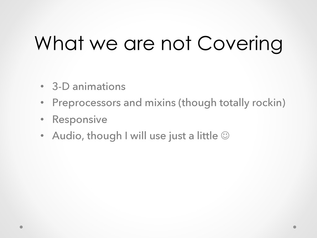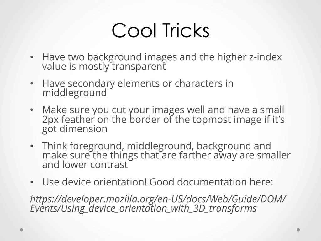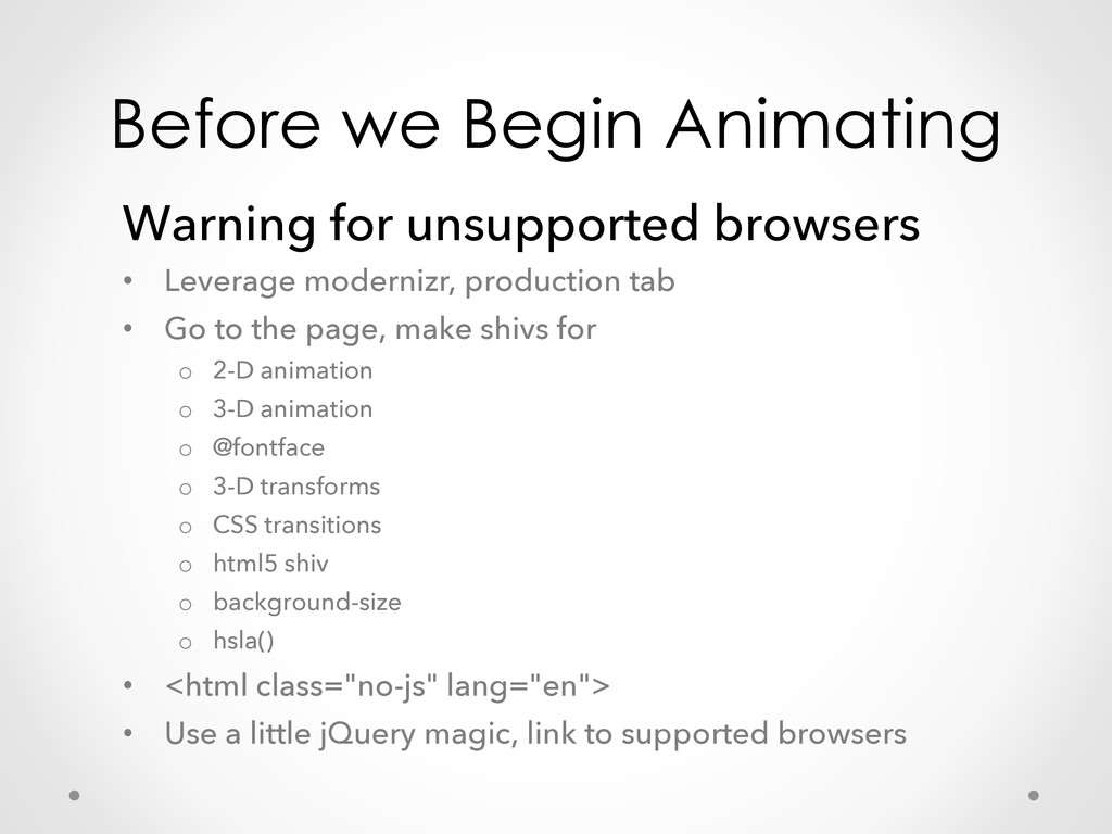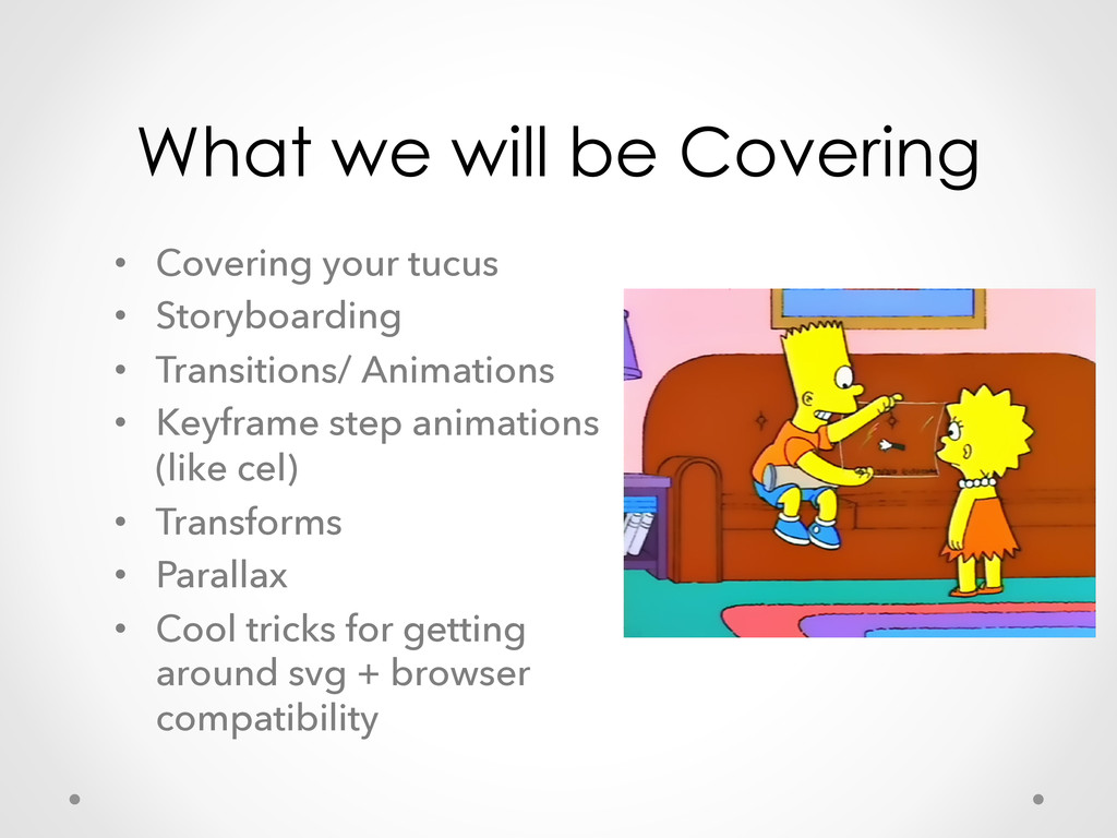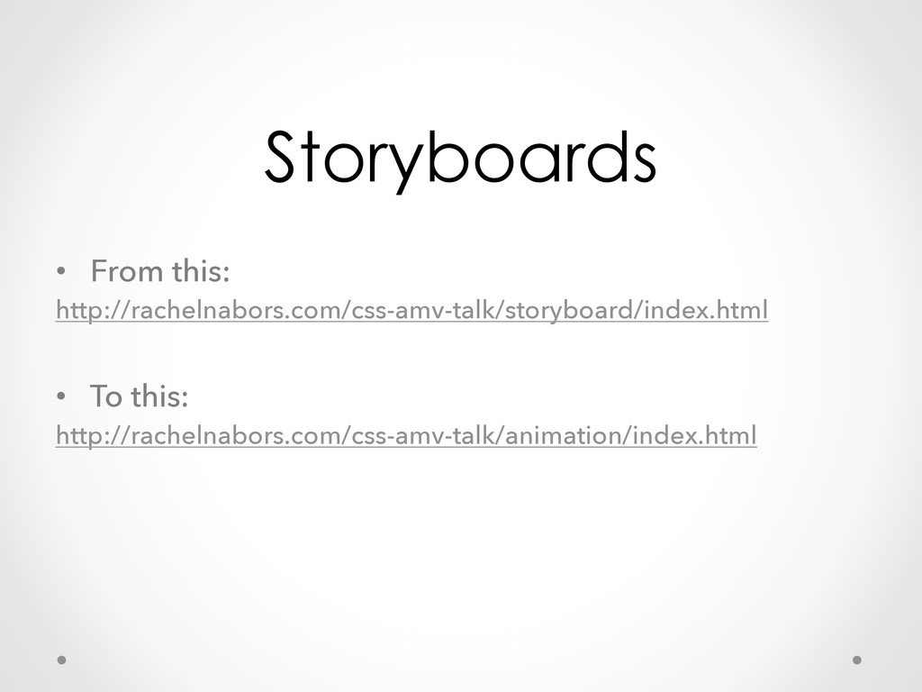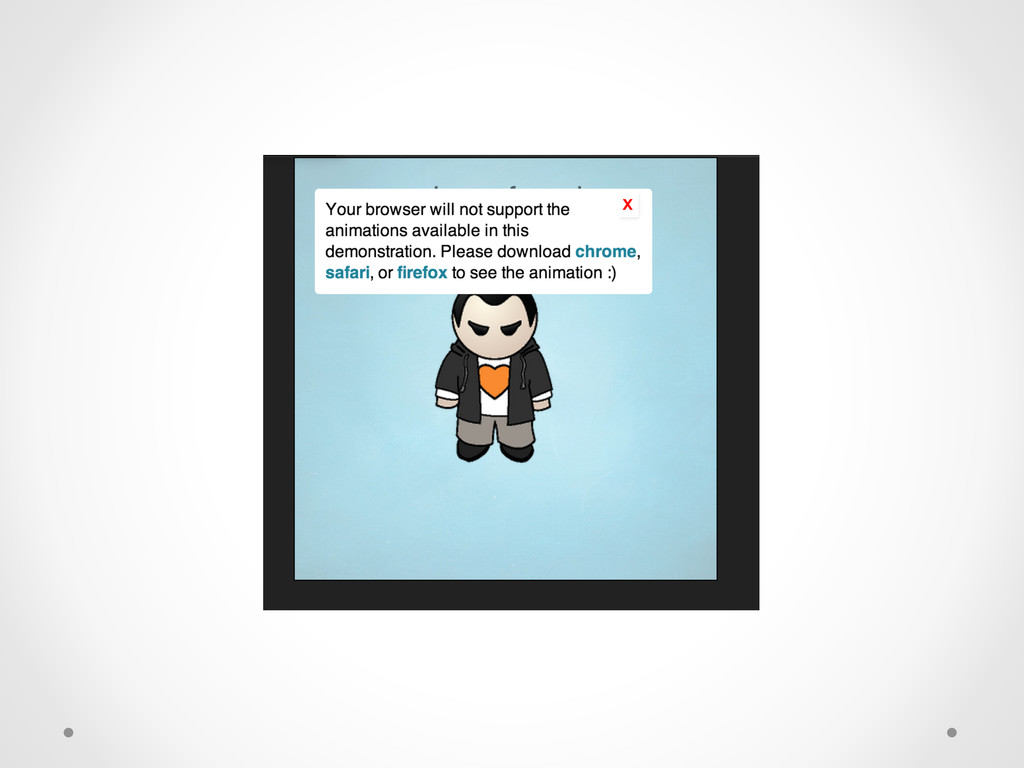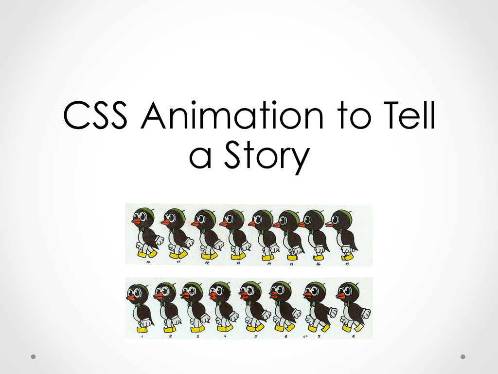 Using advanced techniques, we will be constructing engaging CSS animations with very little to no jQuery. Through the creation of scalable graphics we will emphasize using the smallest amount of code for maximum impact and show when it is appropriate to use transitions versus animations and even how to combine them. We will look at current support for techniques across browsers, and spacial depth with foreground, middleground, and background. We will also be discussing the use of storyboarding to work out ideas to cut down on editing time and the composition of a nuanced character, even if the character is a concept.