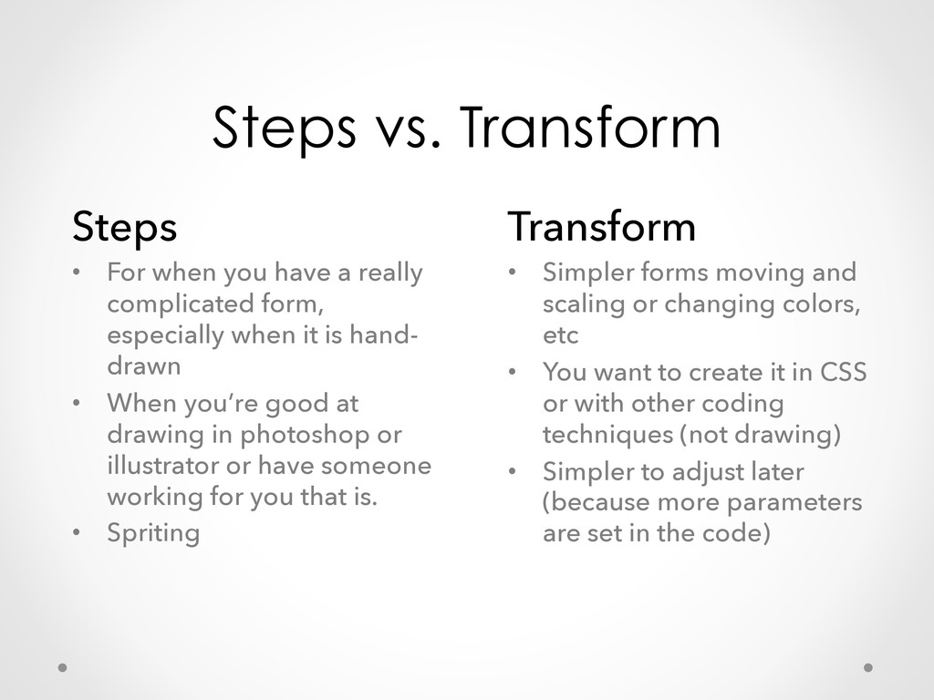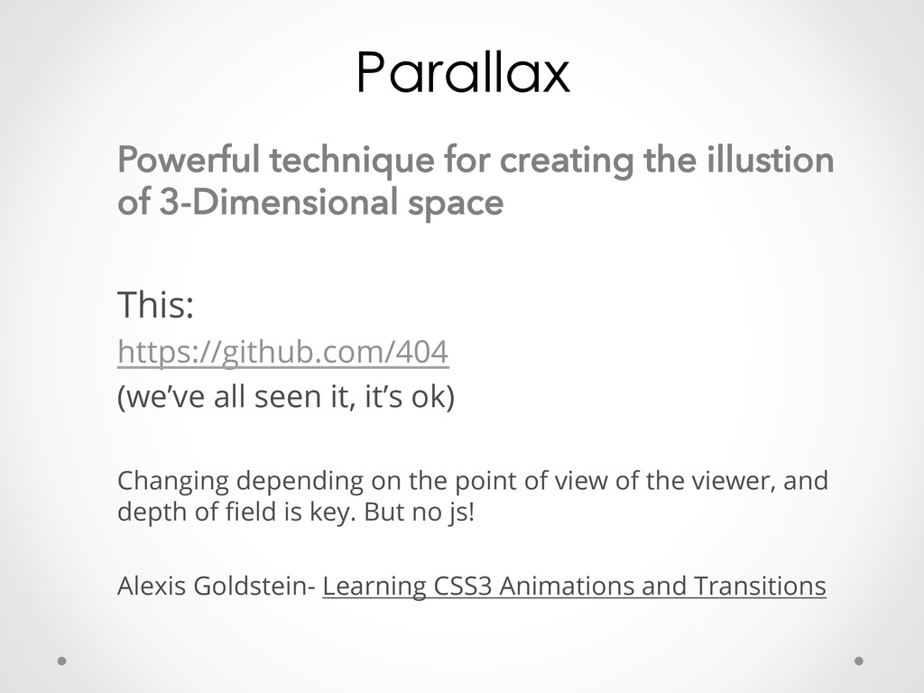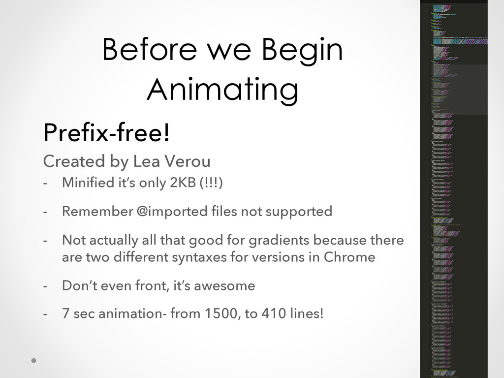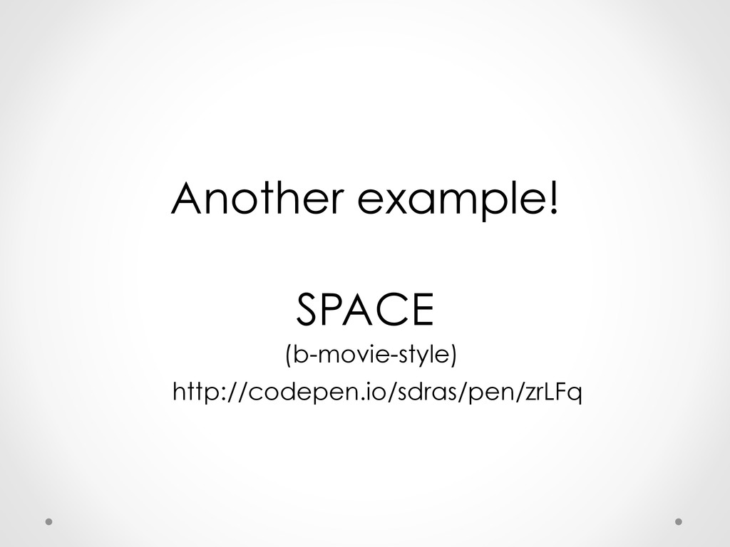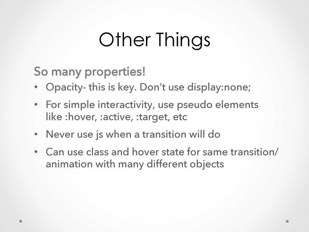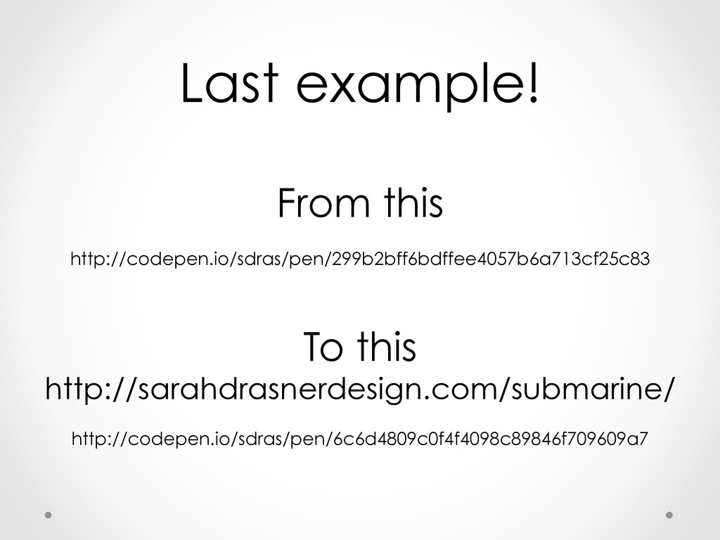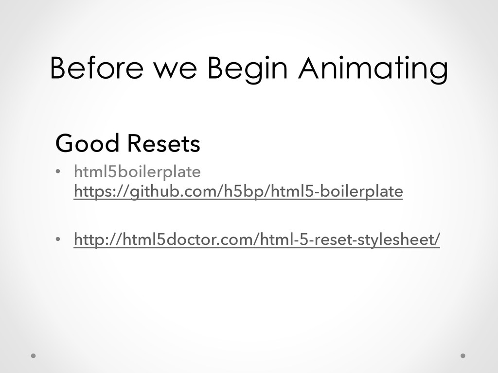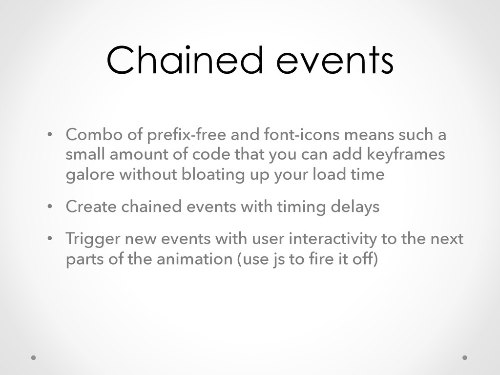 Using advanced techniques, we will be constructing engaging CSS animations with very little to no jQuery. Through the creation of scalable graphics we will emphasize using the smallest amount of code for maximum impact and show when it is appropriate to use transitions versus animations and even how to combine them. We will look at current support for techniques across browsers, and spacial depth with foreground, middleground, and background. We will also be discussing the use of storyboarding to work out ideas to cut down on editing time and the composition of a nuanced character, even if the character is a concept.