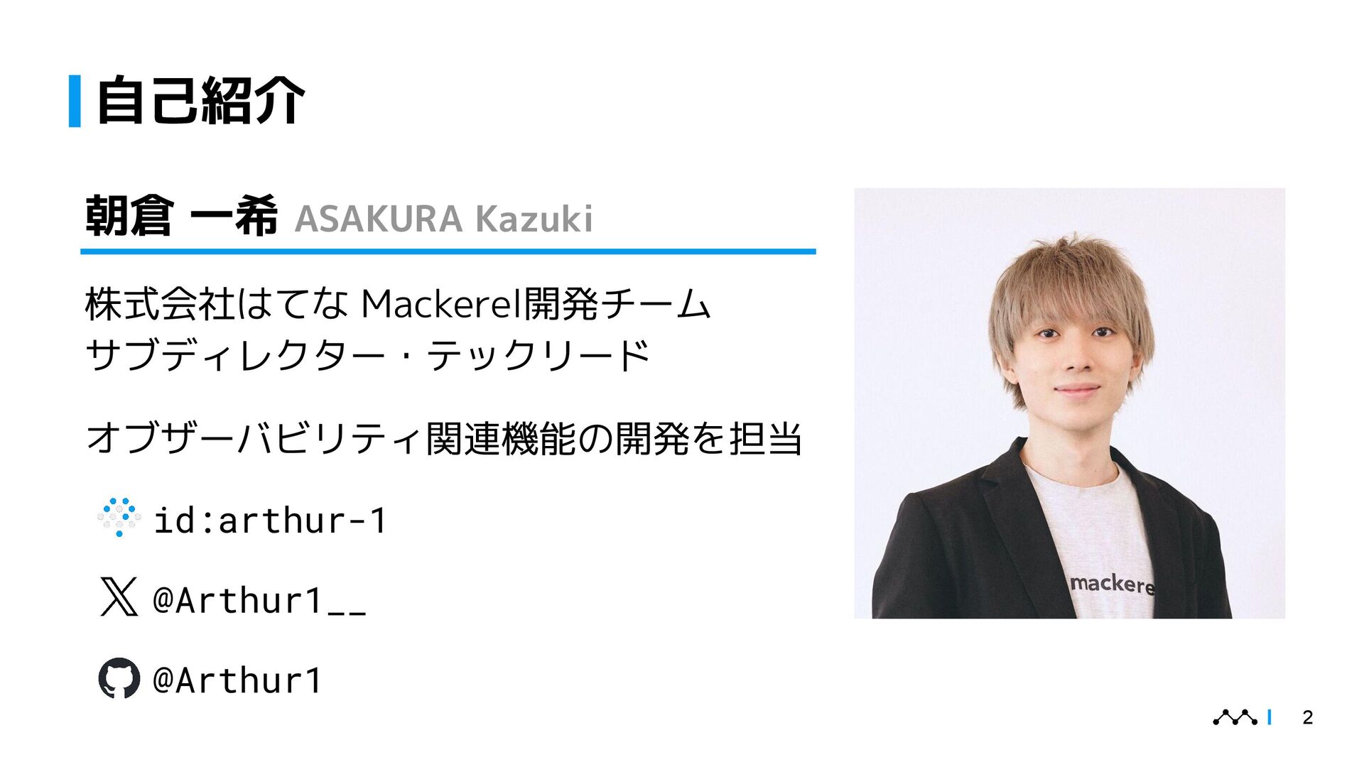 自己紹介 朝倉 一希 ASAKURA Kazuki 株式会社はてな Mackerel開発チーム サブディレクター・テックリード オブザーバビリティ関連機能の開発を担当 id:arthur-1