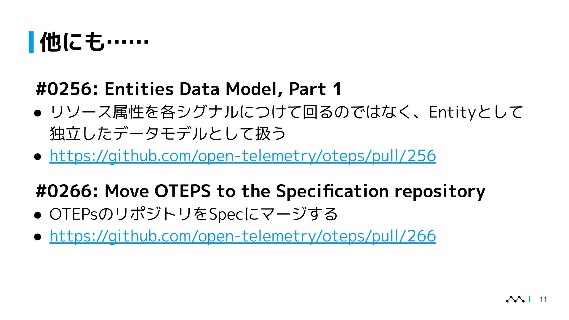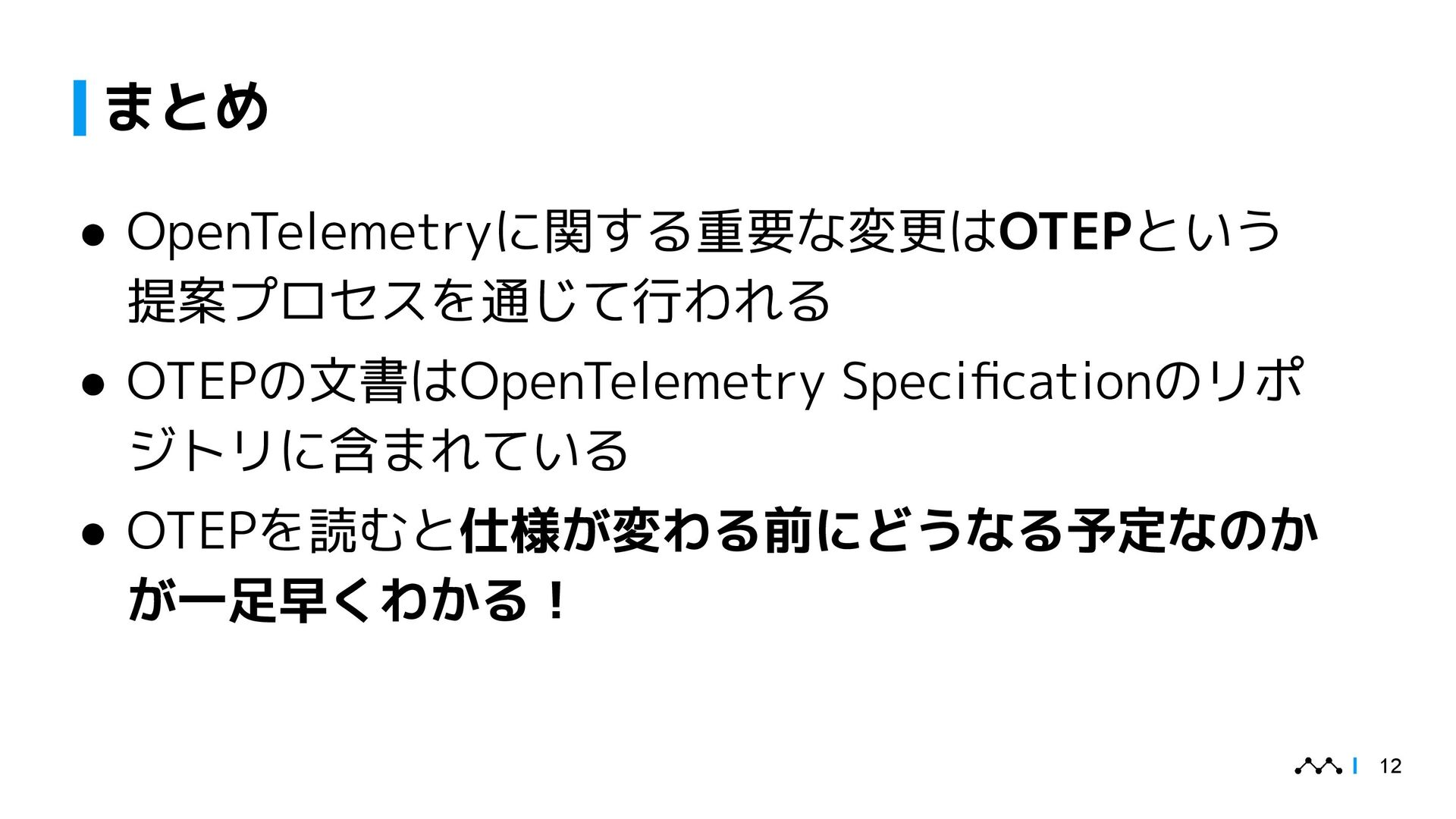 • https://github.com/open-telemetry/oteps/pull/256 #0266: Move OTEPS to the Specification repository • OTEPsのリポジトリをSpecにマージする • https://github.com/open-telemetry/oteps/pull/266 11