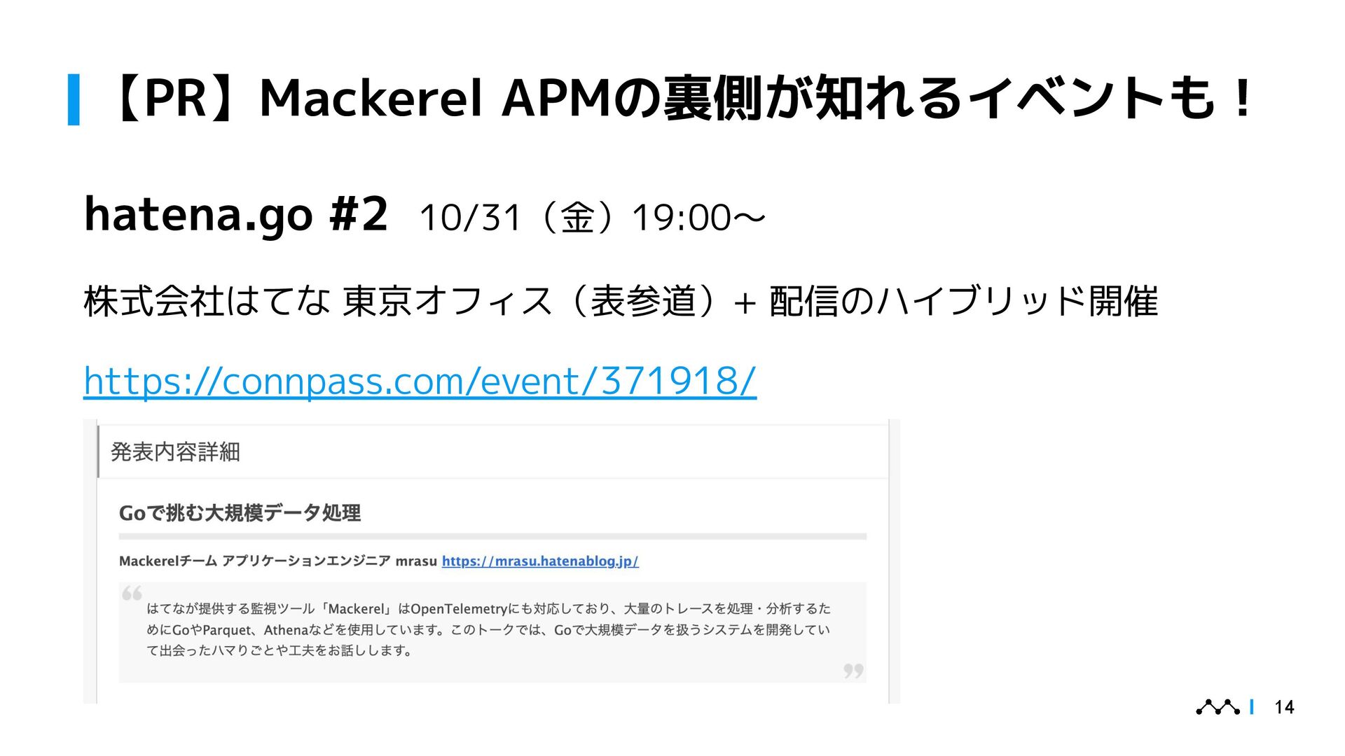 【PR】Mackerel APMの裏側が知れるイベントも! hatena.go #2 10/31(金)19:00〜 株式会社はてな 東京オフィス(表参道)+ 配信のハイブリッド開催 https://connpass.com/event/371918/ 14