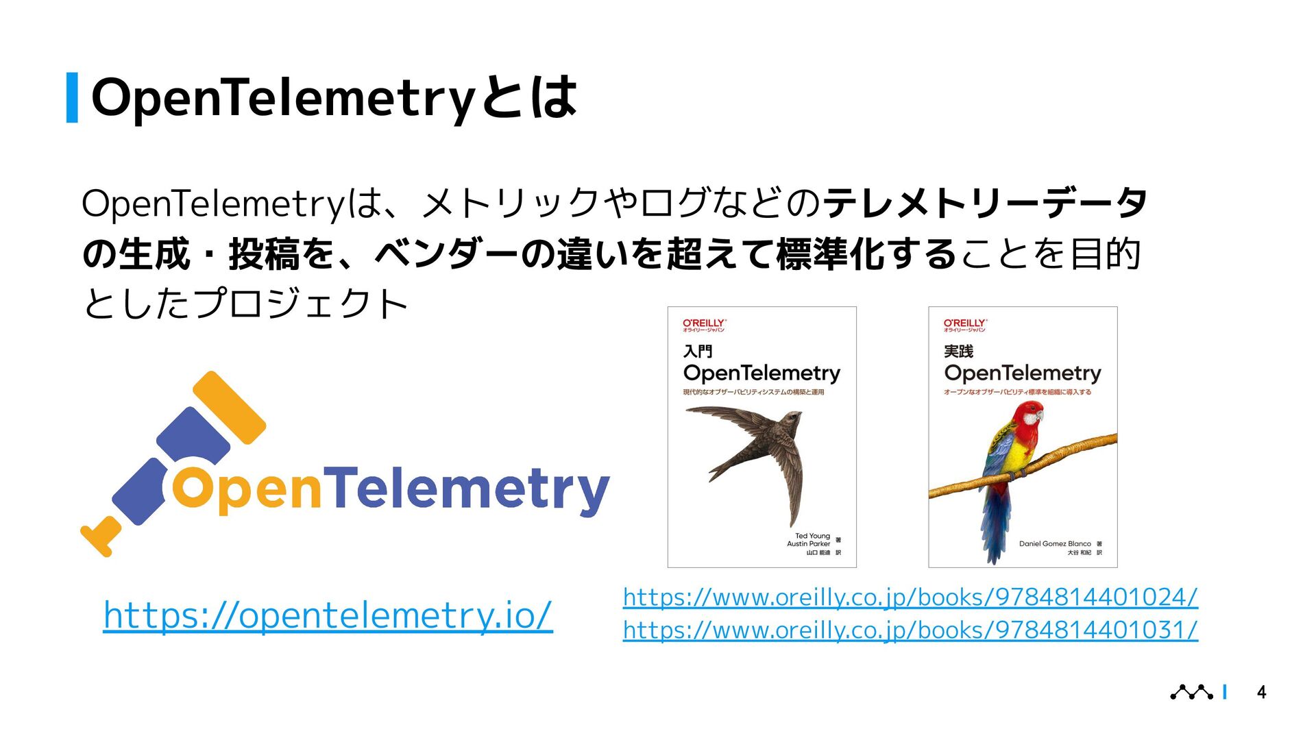 OpenTelemetryとは OpenTelemetryは、メトリックやログなどのテレメトリーデータ の生成・投稿を、ベンダーの違いを超えて標準化することを目的 としたプロジェクト 4 https://opentelemetry.io/ https://www.oreilly.co.jp/books/9784814401024/ https://www.oreilly.co.jp/books/9784814401031/