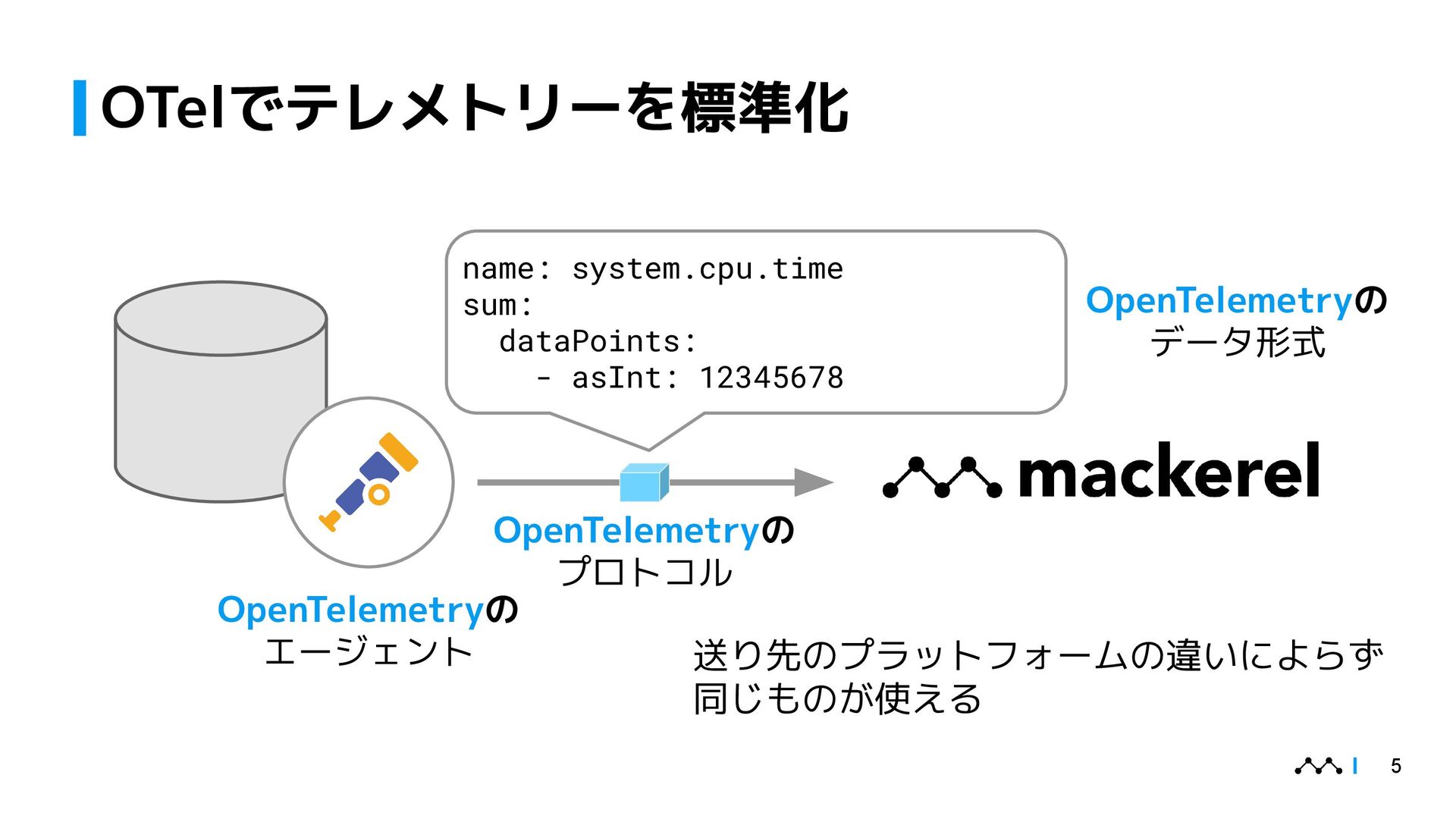- asInt: 12345678 OpenTelemetryの データ形式 送り先のプラットフォームの違いによらず 同じものが使える