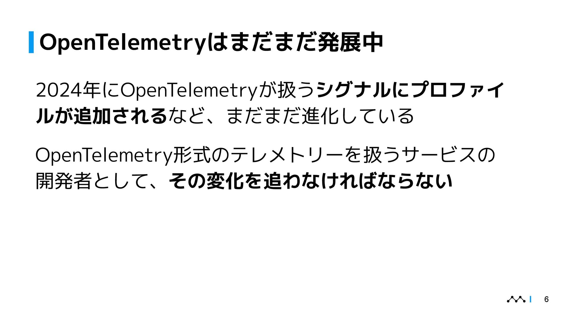 OpenTelemetryはまだまだ発展中 2024年にOpenTelemetryが扱うシグナルにプロファイ ルが追加されるなど、まだまだ進化している OpenTelemetry形式のテレメトリーを扱うサービスの 開発者として、その変化を追わなければならない 6