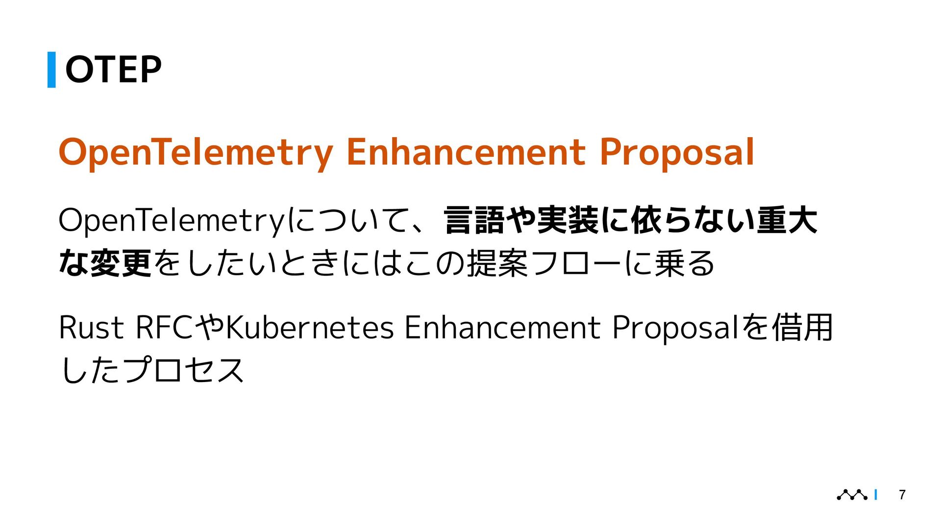 OTEP OpenTelemetry Enhancement Proposal OpenTelemetryについて、言語や実装に依らない重大 な変更をしたいときにはこの提案フローに乗る Rust RFCやKubernetes Enhancement Proposalを借用