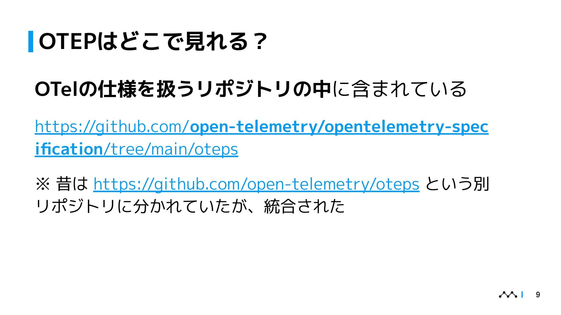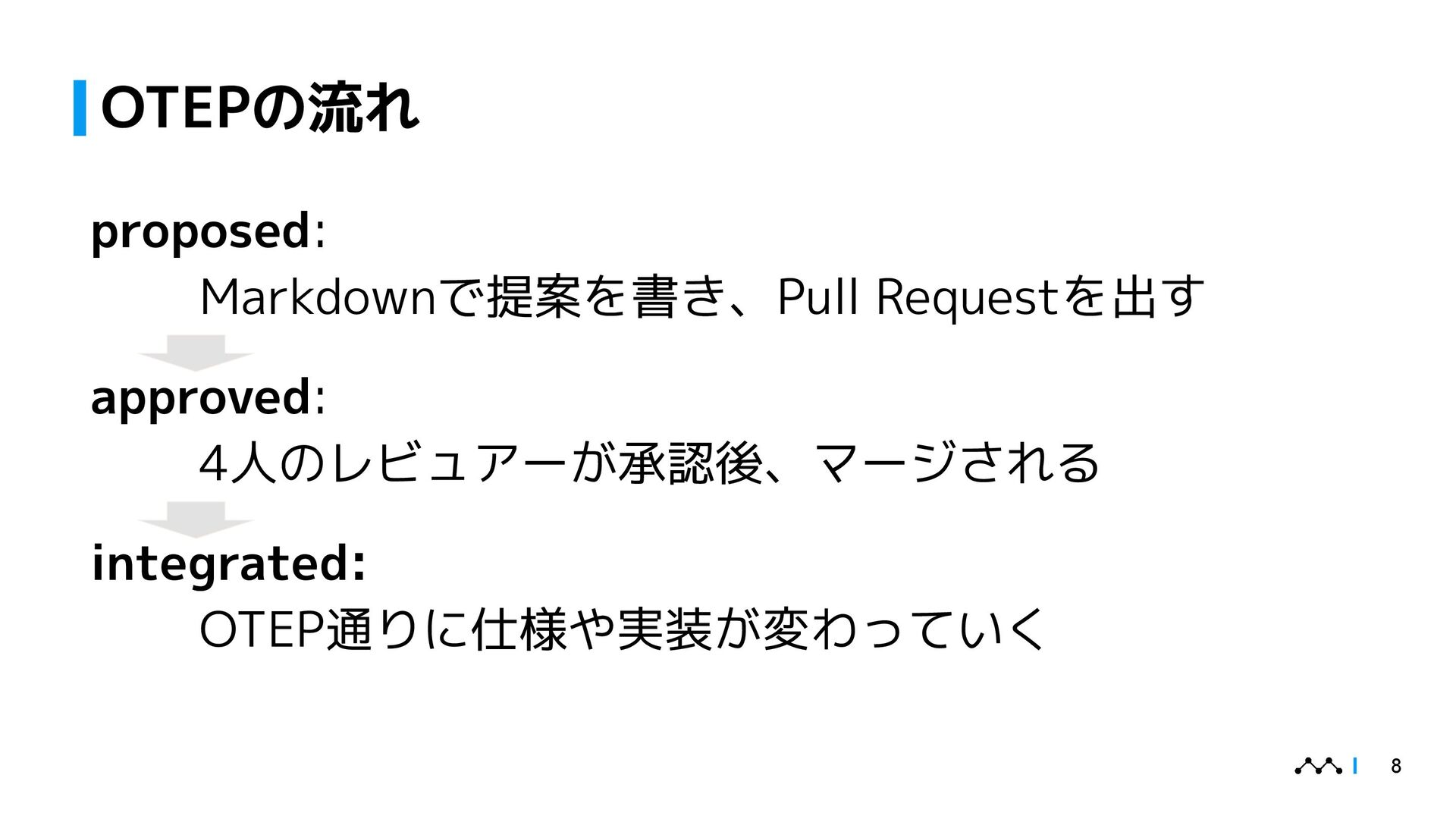 OTEPの流れ proposed: Markdownで提案を書き、Pull Requestを出す approved: 4人のレビュアーが承認後、マージされる integrated: OTEP通りに仕様や実装が変わっていく 8