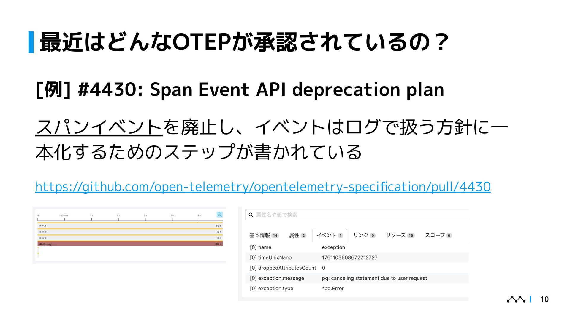 最近はどんなOTEPが承認されているの? [例] #4430: Span Event API deprecation plan スパンイベントを廃止し、イベントはログで扱う方針に一 本化するためのステップが書かれている
