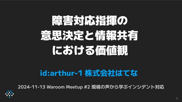 障害対応指揮の 意思決定と情報共有 における価値観 id:arthur-1 株式会社はてな 2024-11-13 Waroom Meetup #2 現場の声から学ぶインシデント対応