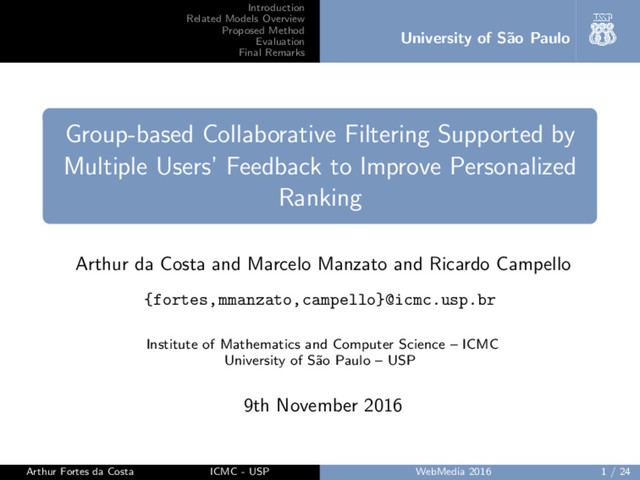 of S˜ ao Paulo Introduction • Increase in data on the Web (users, items, reviews) • Information Retrival, Neural Networks, Bayesian Networks, Association Rules, Machine Learning.. • Content-based and Collaborative algorithms • Implicit Feedback • Explicit Feedback • Problems: memory requirements, time and computing cost, lack of algorithms that use multiple interactions Arthur Fortes da Costa ICMC - USP WebMedia 2016 3 / 24