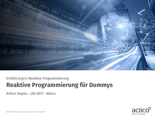 - @actico_de - 11.05.2017 31 Operatoren, Kombinatoren, Transformatoren, Filter, … Operatoren Creating • Create, Defer, Empty/Never/Throw, From, Interval, Just, Range, Repeat, Start, Timer Transforming • Buffer, FlatMap, GroupBy, Map, Scan, Window Filtering • Debounce, Distinct, ElementAt, Filter, First, IgnoreElements, Last, Sample, Skip, SkipLast, Take Combining • And/Then/When, CombineLatest, etc. Error Handling • Catch, Retry Utility • Delay, Do, Timeout, Serialize … Verfügbare Operatoren in RxJava sind ursrprünglich inspiriert von LINQ Reactive Extensions – Operatoren http://reactivex.io/documentation/operators.html