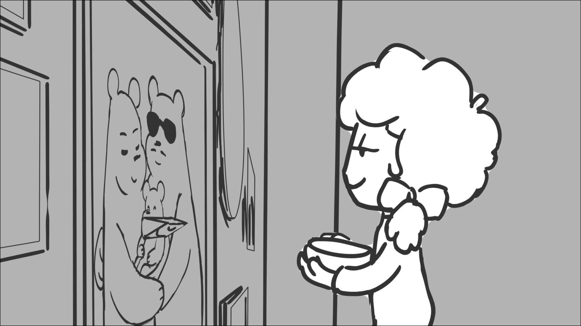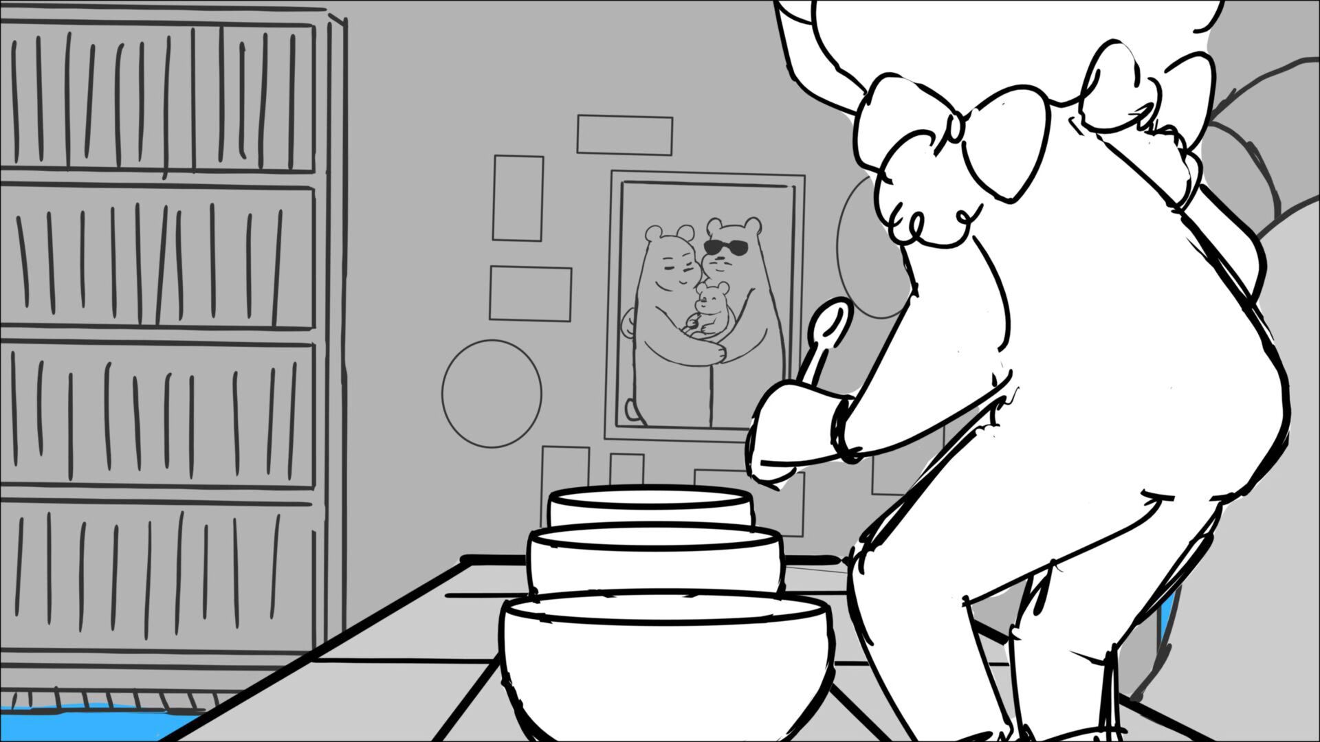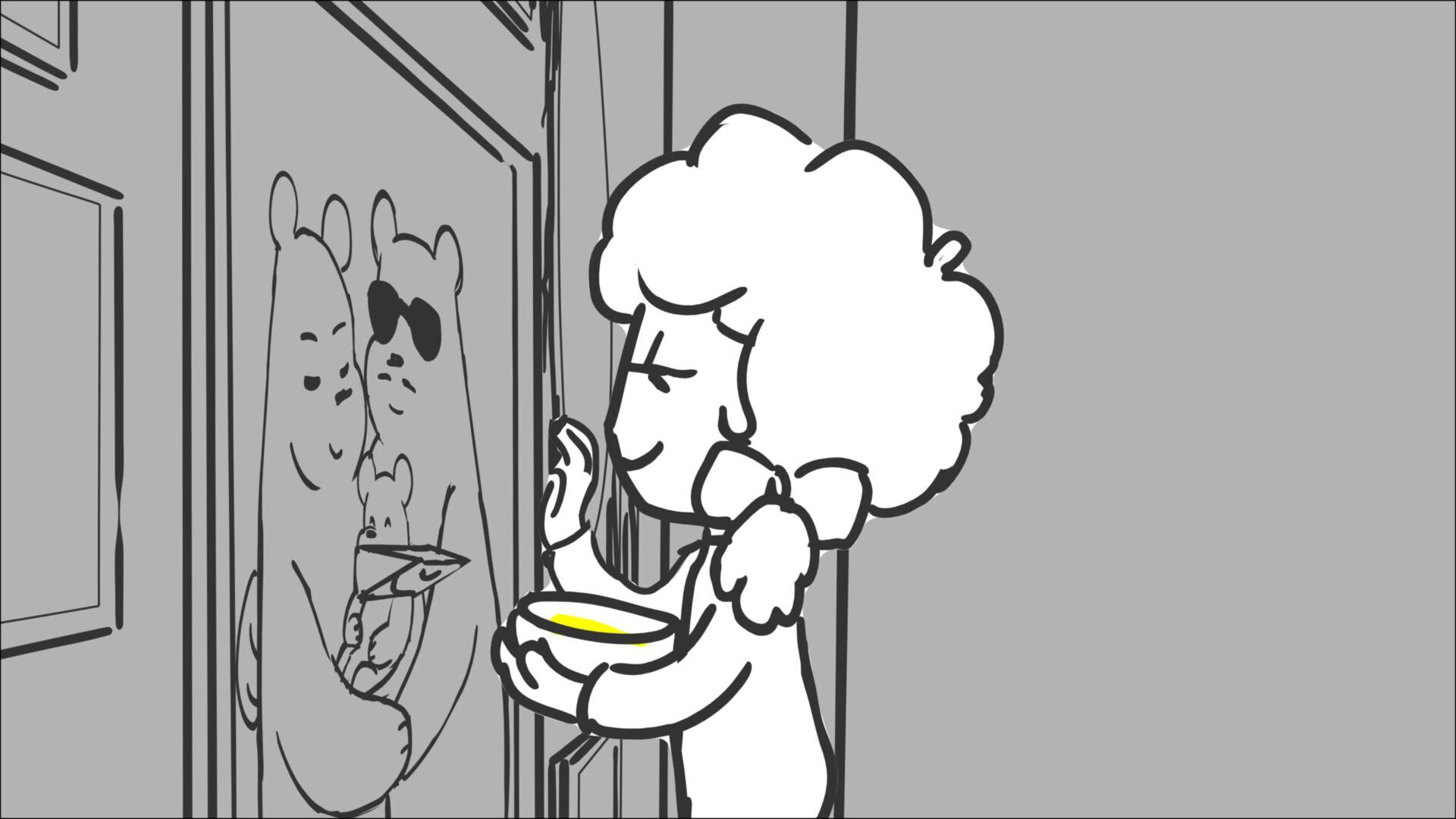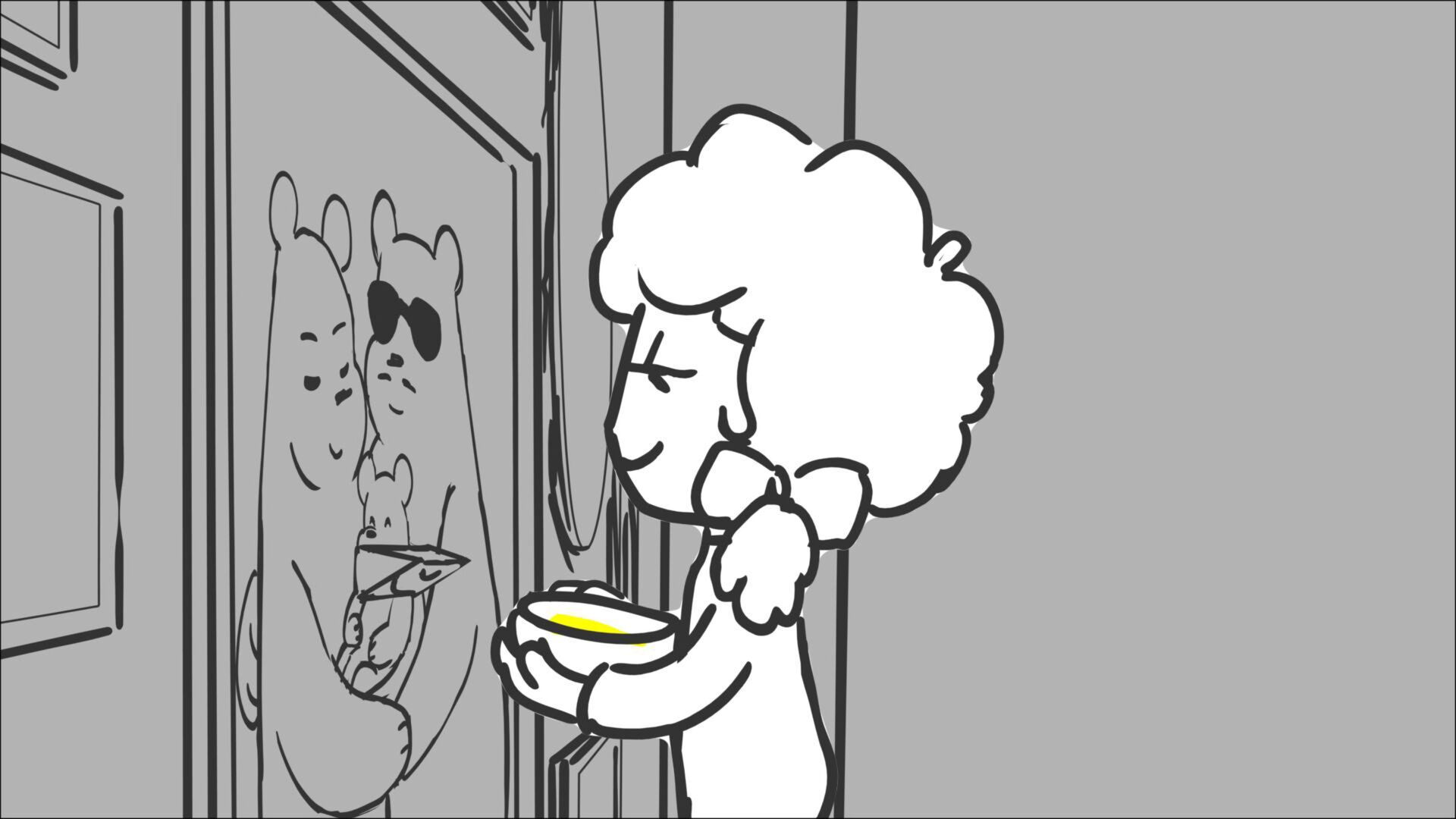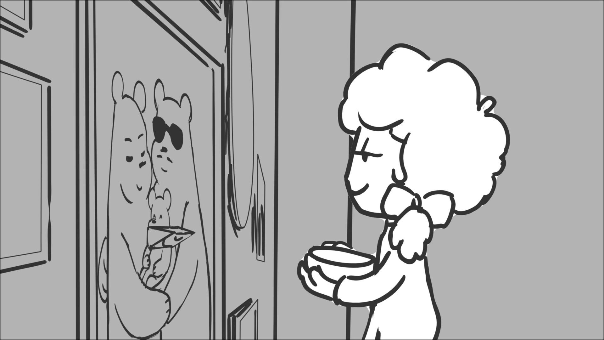 This sequence I had challenged myself to do in 3.5 weeks between November and December, playing around with a more simplified, silly style suited for television. For context: Goldilocks is a seasoned secret agent in a world that is something like “Spy Kids” meets “Shrek.” The Three Bears a crime family that have gotten their paws on a glowing McGuffin, and it’s Goldilock’s job to acquire the goods!