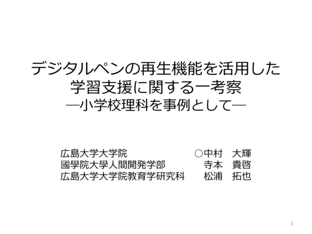 デジタルペンの再生機能を活用した 学習支援に関する一考察 ―小学校理科を事例として― 1 広島大学大学院 ◦中村 大輝 國學院大學人間開発学部 寺本 貴啓