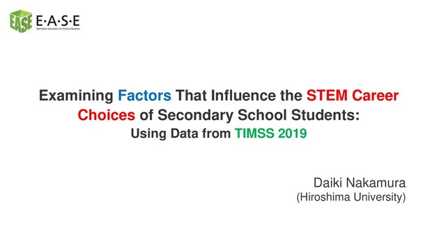 the SCCT fits in different countries. ⚫ Purpose ⚫ Method ➢ Data Data from 8th grade students in Japan, Korea, Taiwan, the United States, and the United Kingdom in the TIMSS 2019 survey. *Teenage career aspirations predict career attainment in adulthood (e.g., Schoon, 2001). ➢ Analysis • Path analysis for data from different countries. • Checking for goodness of fit. • Estimation of direct and indirect effects.