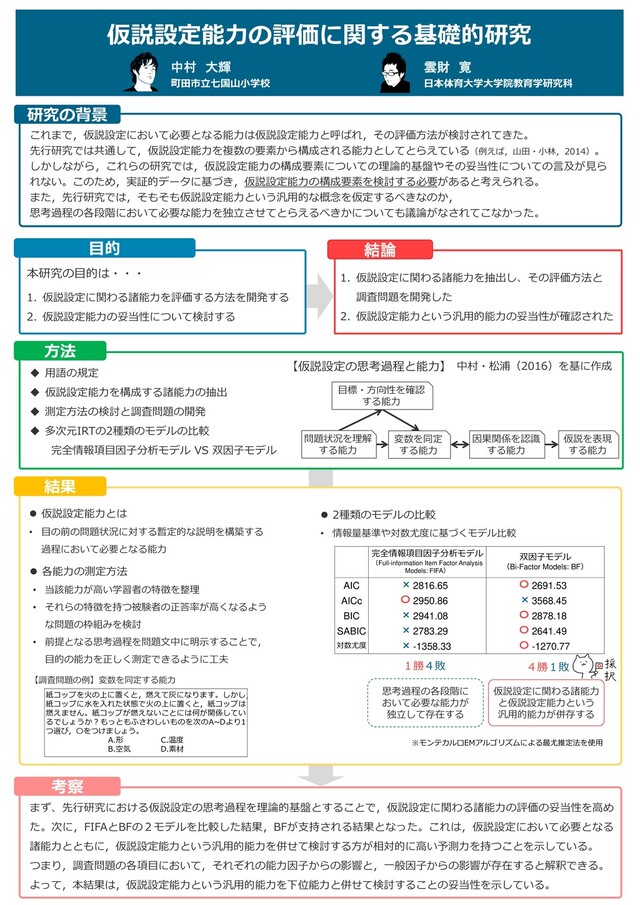 しかしながら,これらの研究では,仮説設定能力の構成要素についての理論的基盤やその妥当性についての言及が見ら れない。このため,実証的データに基づき,仮説設定能力の構成要素を検討する必要があると考えられる。 また,先行研究では,そもそも仮説設定能力という汎用的な概念を仮定するべきなのか, 思考過程の各段階において必要な能力を独立させてとらえるべきかについても議論がなされてこなかった。 1. 仮説設定に関わる諸能力を評価する方法を開発する 2. 仮説設定能力の妥当性について検討する 本研究の目的は・・・ 1. 仮説設定に関わる諸能力を抽出し、その評価方法と 調査問題を開発した 2. 仮説設定能力という汎用的能力の妥当性が確認された 用語の規定 仮説設定能力を構成する諸能力の抽出 測定方法の検討と調査問題の開発 多次元IRTの2種類のモデルの比較 完全情報項目因子分析モデル VS 双因子モデル まず、先行研究における仮説設定の思考過程を理論的基盤とすることで,仮説設定に関わる諸能力の評価の妥当性を高め た。次に,FIFAとBFの2モデルを比較した結果,BFが支持される結果となった。これは,仮説設定において必要となる 諸能力とともに,仮説設定能力という汎用的能力を併せて検討する方が相対的に高い予測力を持つことを示している。 つまり,調査問題の各項目において,それぞれの能力因子からの影響と,一般因子からの影響が存在すると解釈できる。 よって,本結果は,仮説設定能力という汎用的能力を下位能力と併せて検討することの妥当性を示している。 方法 結果 各能力の測定方法 • 当該能力が高い学習者の特徴を整理 • それらの特徴を持つ被験者の正答率が高くなるよう な問題の枠組みを検討 • 前提となる思考過程を問題文中に明示することで, 目的の能力を正しく測定できるように工夫 問題状況を理解 する能力 目標・方向性を確認 する能力 変数を同定 する能力 因果関係を認識 する能力 仮説を表現 する能力 【仮説設定の思考過程と能力】 仮説設定能力とは • 目の前の問題状況に対する暫定的な説明を構築する 過程において必要となる能力 雲財 寛 日本体育大学大学院教育学研究科 完全情報項目因子分析モデル (Full-information Item Factor Analysis Models: FIFA) 双因子モデル (Bi-Factor Models: BF) AIC × 2816.65 〇 2691.53 AICc 〇 2950.86 × 3568.45 BIC × 2941.08 〇 2878.18 SABIC × 2783.29 〇 2641.49 対数尤度 × -1358.33 〇 -1270.77 2種類のモデルの比較 • 情報量基準や対数尤度に基づくモデル比較 1勝4敗 4勝1敗 思考過程の各段階に おいて必要な能力が 独立して存在する 仮説設定に関わる諸能力 と仮説設定能力という 汎用的能力が併存する 紙コップを火の上に置くと,燃えて灰になります。しかし, 紙コップに水を入れた状態で火の上に置くと,紙コップは 燃えません。紙コップが燃えないことには何が関係してい るでしょうか?もっともふさわしいものを次のA~Dより1 つ選び,〇をつけましょう。 A.形 C.温度 B.空気 D.素材 【調査問題の例】変数を同定する能力 ※モンテカルロEMアルゴリズムによる最尤推定法を使用 中村・松浦(2016)を基に作成