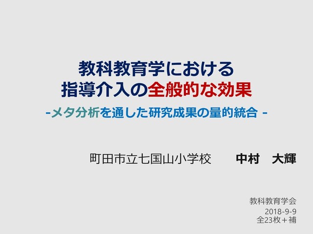 教科教育学における 指導介入の全般的な効果 -メタ分析を通した研究成果の量的統合 - 町田市立七国山小学校 中村 大輝 教科教育学会 2018-9-9 全23枚+補