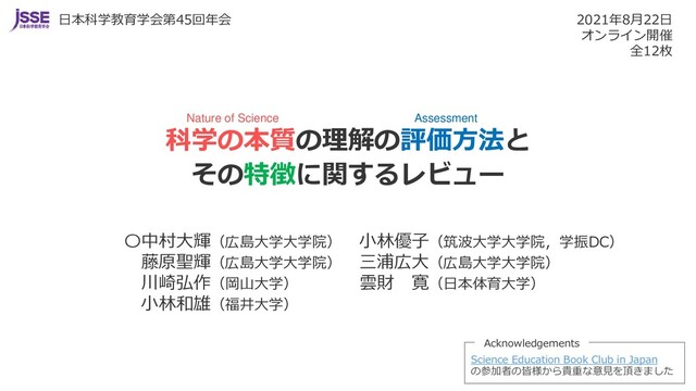• 回答形式[多肢選択、〇件法、自由記述、面接、他] • 調査対象[小、中、高、大、教師] • 測定要素[証拠、理/則、方法、創造、主観、社会、 区別、暫定、限界] 測定している=1, 測定していない=0 目的 ⚫ 評価方法の開発論文の抽出 a. Google Scholar を用いたキーワード検索 “Nature of Science” AND (Assessment OR Scale OR Questionnaire) →関連性が高い順に70件ほど確認 b. Lederman et al.(2014)に示された29件の評価方法 c. その他、探索的な文献収集 方法 Lederman et al.(2014)