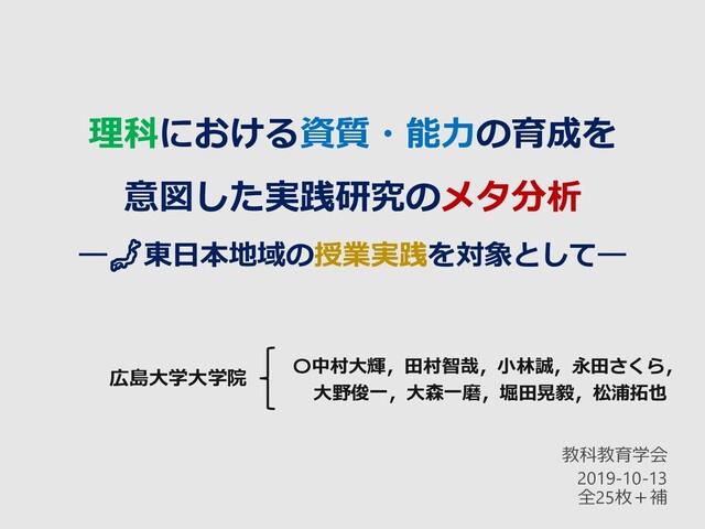 理科における資質・能力の育成を 意図した実践研究のメタ分析 ―🗾東日本地域の授業実践を対象として― 〇中村大輝,田村智哉,小林誠,永田さくら, 大野俊一,大森一磨,堀田晃毅,松浦拓也 教科教育学会 2019-10-13 全25枚+補 広島大学大学院
