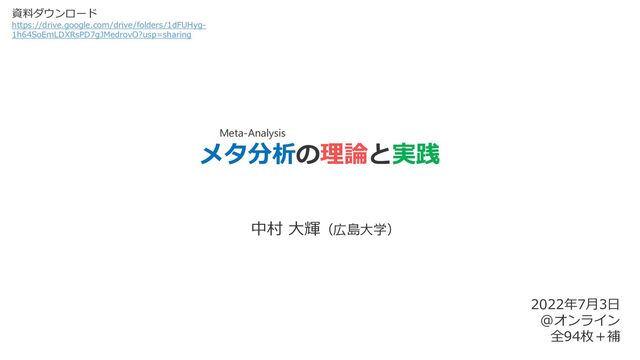 Larry V. Hedges, Harris Cooper, Ingram Olkin, John E. Hunter, Jacob Cohen, Robert Rosenthal, Frank L. Schmidt, John E. Hunter らの貢献が大きい • 1970年代以降、教育学、心理学、医学、生態学など複数の分野でメタ分析が盛んにおこな われる ➢ Lipsey & Wilson(1993):心理・教育・行動的介入に関する302個のメタ分析の結果 を検討し,効果量の平均が0.50,標準偏差が0.29であったことを示している • 1980年代に入ると、ナラティブレビューに代わり、メタ分析やシステマティックレビュー が主流になってくる。 • 2000年代以降、論文データベースが整理されていく中でより活発にメタ分析が 行われるようになってきている • 2008年には、ジョン・ハッティによる大規模なメタ・メタ分析が実施される • 2010年には、Research Synthesis Methods が発行された
