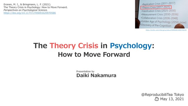 Tokyo ☕ May 13, 2021 Presentation by Daiki Nakamura Eronen, M. I., & Bringmann, L. F. (2021). The Theory Crisis in Psychology: How to Move Forward. Perspectives on Psychological Science. https://doi.org/10.1177/1745691620970586 https://twitter.com/chbergma/status/928960816589746182