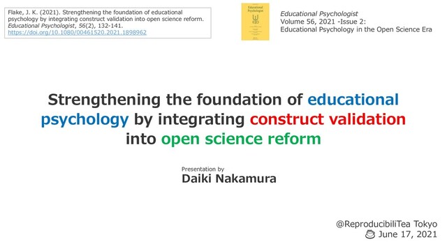 into open science reform Presentation by Daiki Nakamura @ReproducibiliTea Tokyo ☕ June 17, 2021 Flake, J. K. (2021). Strengthening the foundation of educational psychology by integrating construct validation into open science reform. Educational Psychologist, 56(2), 132-141. https://doi.org/10.1080/00461520.2021.1898962 Educational Psychologist Volume 56, 2021 -Issue 2: Educational Psychology in the Open Science Era