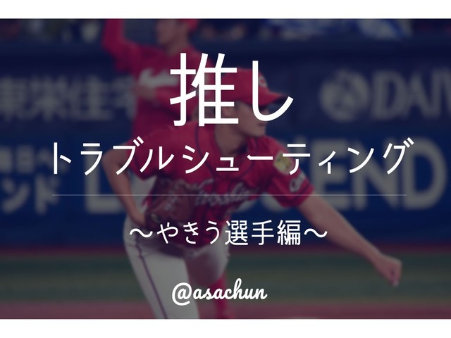 やきう選手を推すときの心得 Oshi Troubleshooting •やきう選手を推すことは修羅道と知る •想像以上にメンタルを左右される •打てないだとか炎上だとかで一喜一憂してたら心が保たない •推しを一人に絞らない •推しを複数作ることで一人の調子が悪くても他に逃げられる •できれば野球とはなるべく離れたジャンルに作るのがよい (アイドル、役者、アニメ、ゲームなど)
