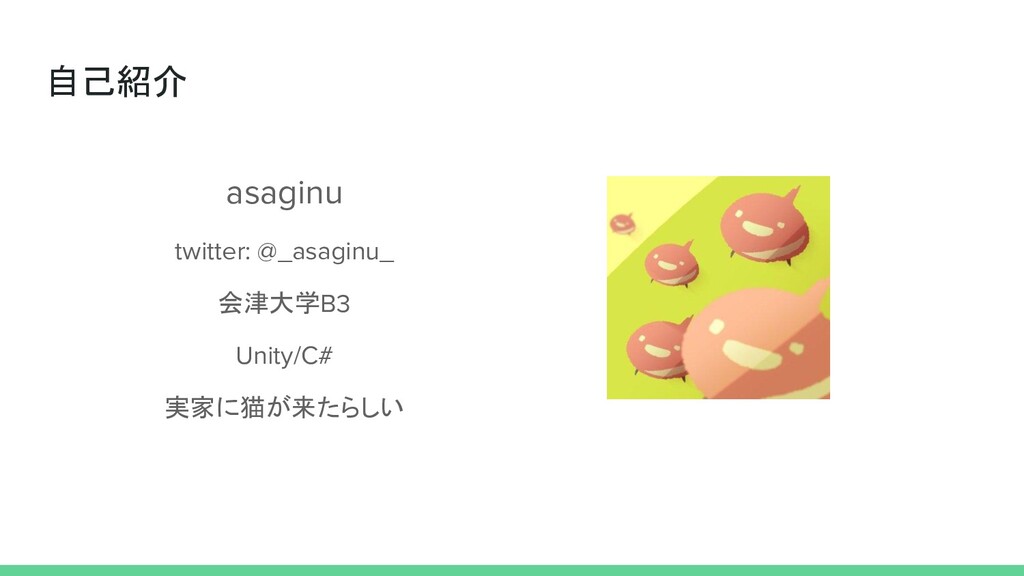 自己紹介 asaginu twitter: @_asaginu_ 会津大学B3 Unity/C# 実家に猫が来たらしい